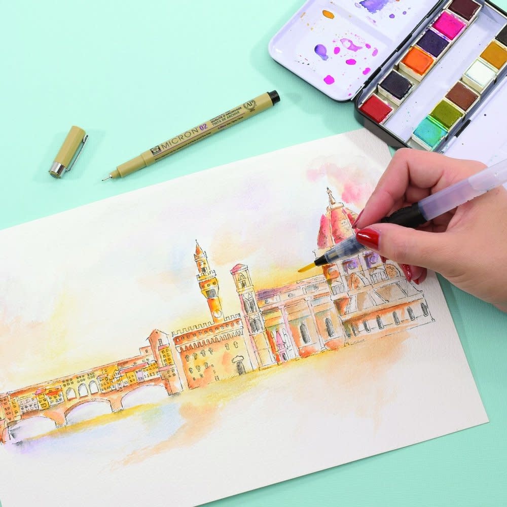 Naast aquarelverf of potloden kun je ook gebruikmaken van aquarelstiften, kleurpotloden, brush pennen, viltstiften, fineliners, waterverf of inkt. Snijd de vellen eenvoudig op maat voor kleinere projecten of kies voor een andere papiersoort als basis. Het Florence aquarelpapier is verkrijgbaar in de volgende formaten: A6, A5, A4, A3 of vierkant (30,5 x 30,5 cm) en is ook beschikbaar in 200 g/m² vellen met een glad of ruw oppervlak. Textuur aquarelpapier is een goede basis voor aquareltechnieken zoals de nat-in-nattechniek of het laveren, omdat dit papier nog beter tegen water kan en niet krom trekt.