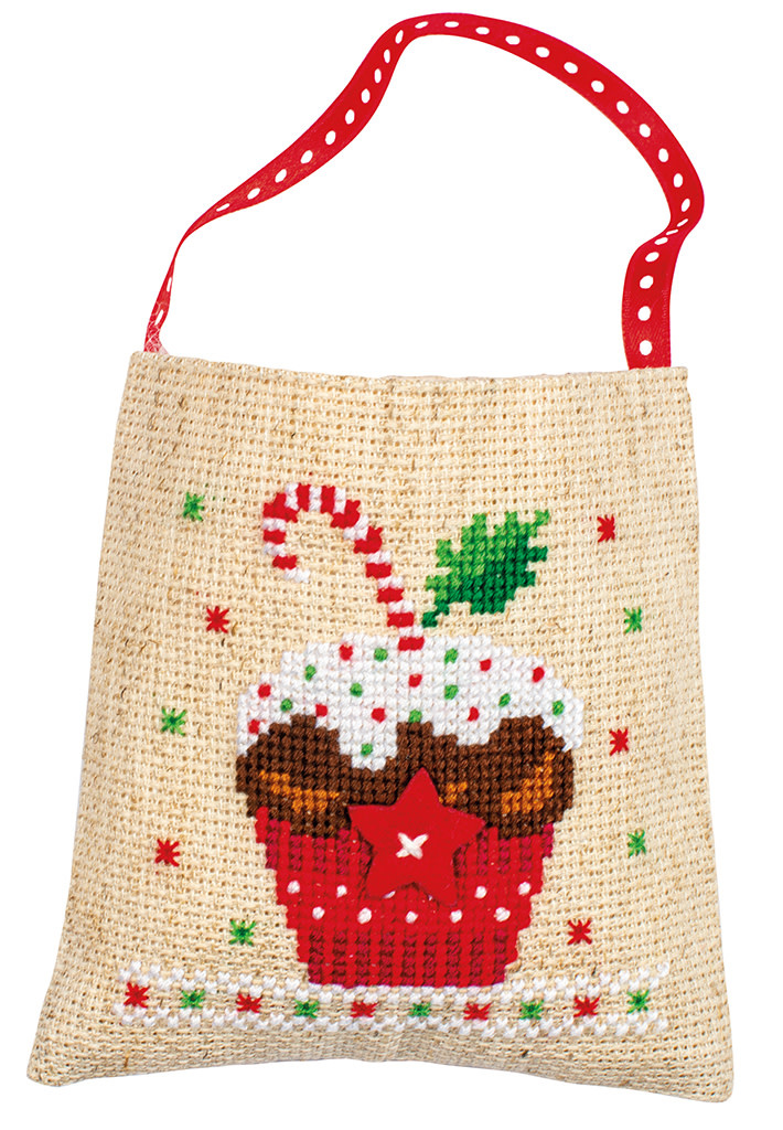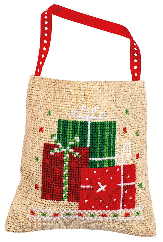 Telpakket met telpatroon, 3 half geconfectioneerde zakjes, Borduurstof: 44% Katoen,39% Viscose, 17% Linnen, Garen: 100% katoen DMC, Aida 7 steken/cm, Garenkaartje, Werkwijze in 8 talen, Vergroot telpatroon, Naald - Foto, Garen voor sluitingsdraad - Met lintje, ca. 9 x 9 cm