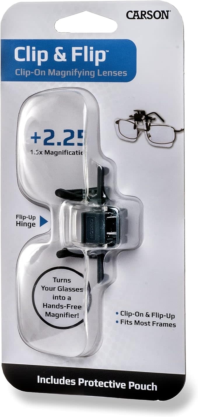 Carson Clip&Flip Loepbril 1,5x (+2,25 dioptrie) clip-on lens met opklapmechanisme.