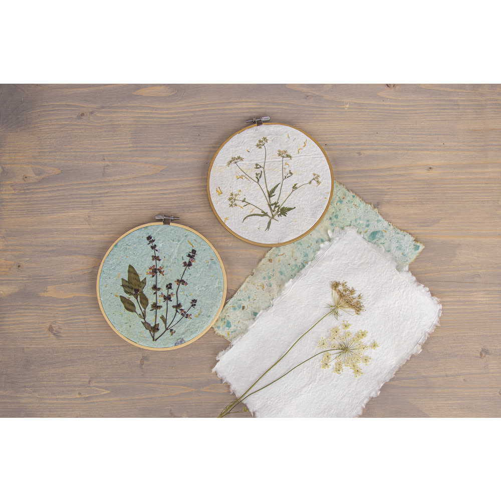 Met behulp van ons papieren schepraam, kunt u geweldige individuele natuurlijke papiersoorten maken. Of het nu wordt ingelijst of gebruikt als persoonlijk briefpapier of weggegeven, dit is iets heel bijzonders.
