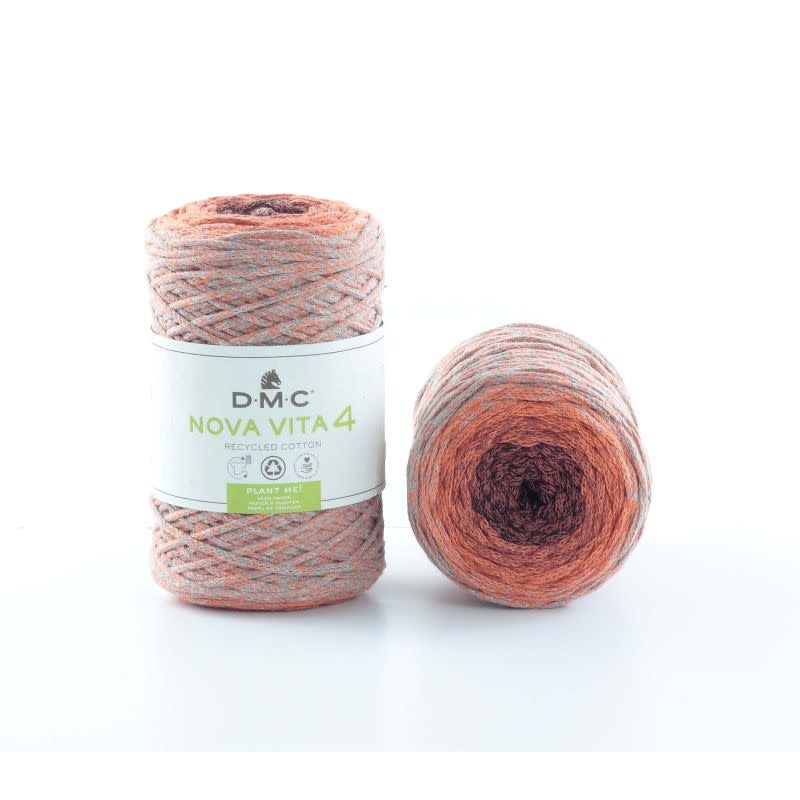 Het nieuwe garen Nova Vita nr. 4 van DMC is net als het dikkere Nova Vita nr. 12 gemaakt van gerecycled textiel. Dat is goed voor het milieu en geeft u bovendien de gelegenheid om nog meer leuke woon- en modeaccessoires te maken. Nova Vita wordt gemaakt van textielafval dat gemalen, geverfd en opnieuw wordt gesponnen. Daarnaast heeft het garen een gerecyclede verpakking en stopt u de banderol in de grond in plaats van die weg te gooien – de banderol is namelijk zaadpapier (of groeipapier) waarmee plantjes en dus nieuw leven kunnen worden gekweekt. Het koordgaren heeft een doorsnee van 2.50-3.00mm en bestaat uit een geweven omhulsel rond een dunnere draad die het zijn stevigheid geeft. Het is bij uitstek geschikt voor het haken, breien of macrameeën van woon- en modeaccessoires, zoals tassen, placemats, kussens, lampenkappen of plantenhangers. Verkrijgbaar in 12 unikleuren en 6 multicolour tinten. Nova Vita nr. 4 is samengesteld uit 80% gerecycled katoen en 20% polyester en heeft het OEKO-TEX® Standard 100 keurmerk. Wasbaar tot 30ᵒC. De aanbevolen naalddikte voor breien is 5.00mm en voor haken 4.00mm. Een bol Nova Vita nr. 4 weegt 250 gram en heeft een looplengte van 200 meter.