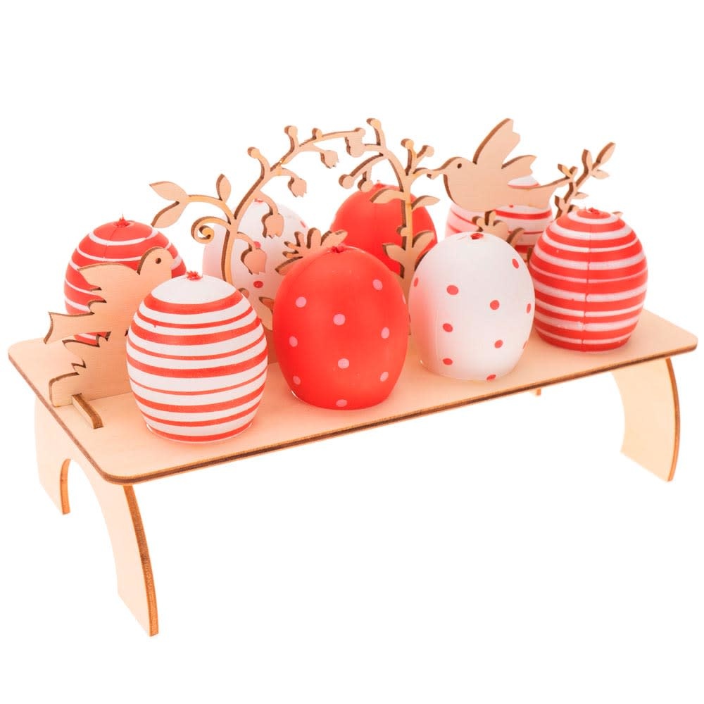 Houten stand voor eieren met vogelfiguren
