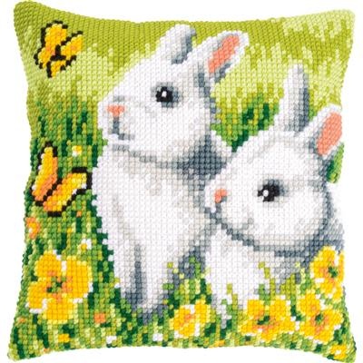 KRUISSTEEKKUSSEN KIT KONIJNEN EN VLINDERS ca. 40 x 40 cm