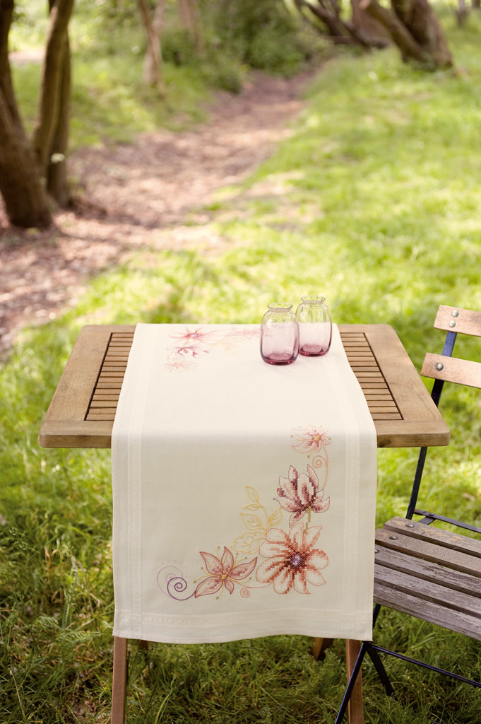 Bedrukte loper met ingeweven boord, Borduurstof: 100% katoen, Garen: 100% katoen DMC, Garenkaartje, Werkwijze in 8 talen, Vergroot patroon, Naald, Foto, Uitwasbare verf, Geconfectioneerd, ca. 40 x 100 cm / 16" x 40", Leeftijdscategorie: vanaf 15 jaar, Steken: kruissteek, Steelsteek