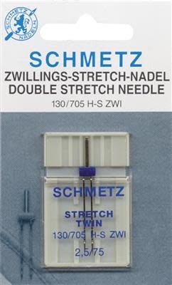 "De schmetz stretch tweelingnaald wordt gebruikt voor dubbele stiksels in elastische stoffen. Deze naald heeft dikte 75 met breedte 2,5