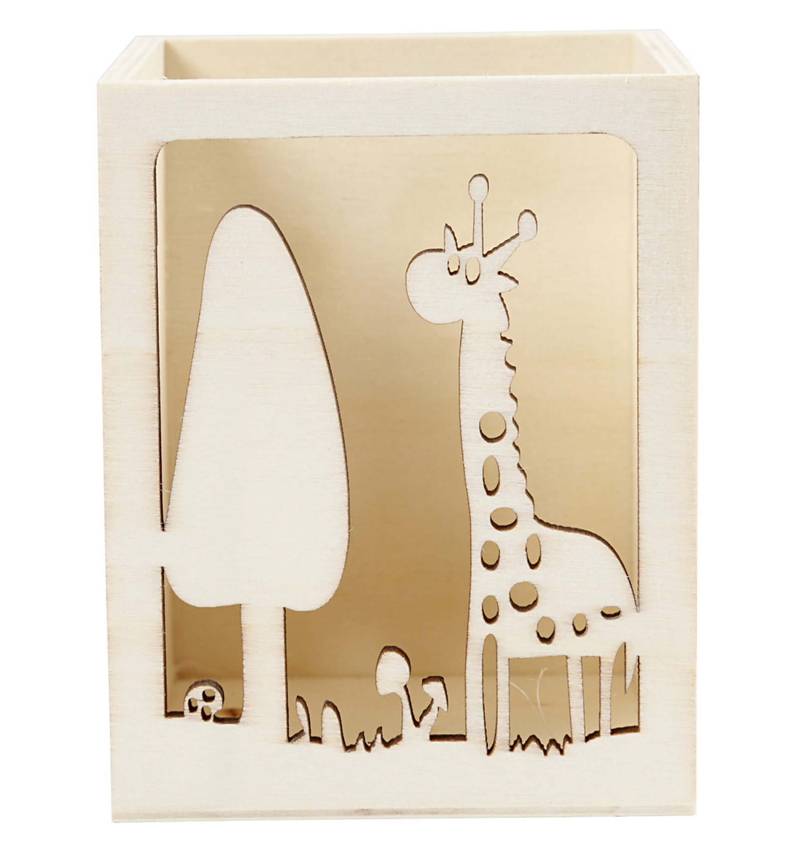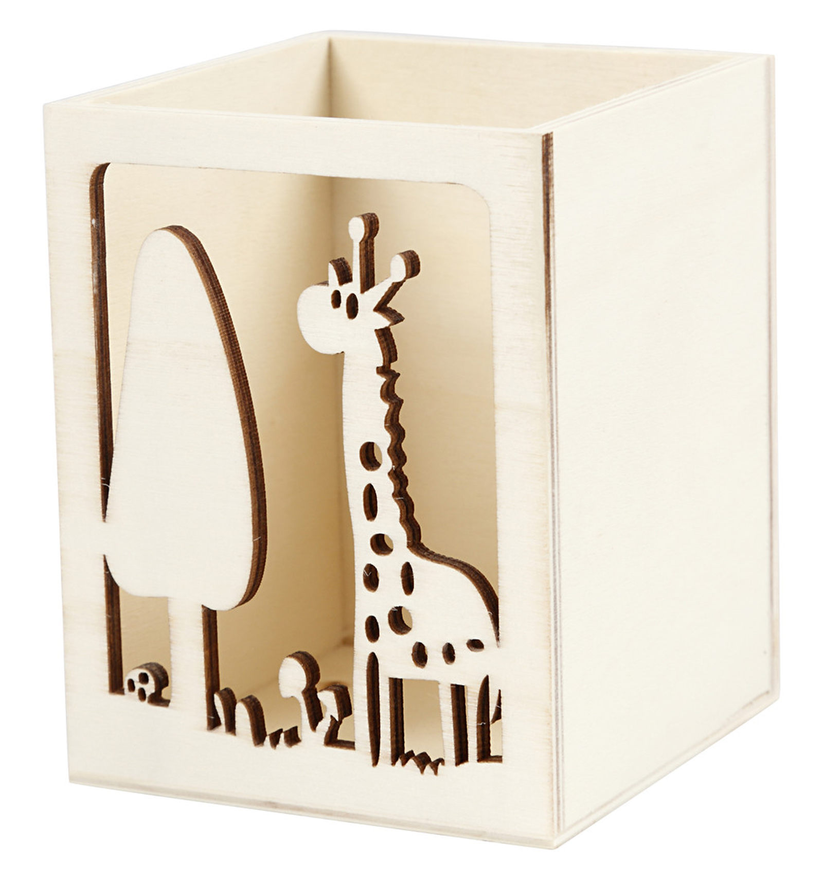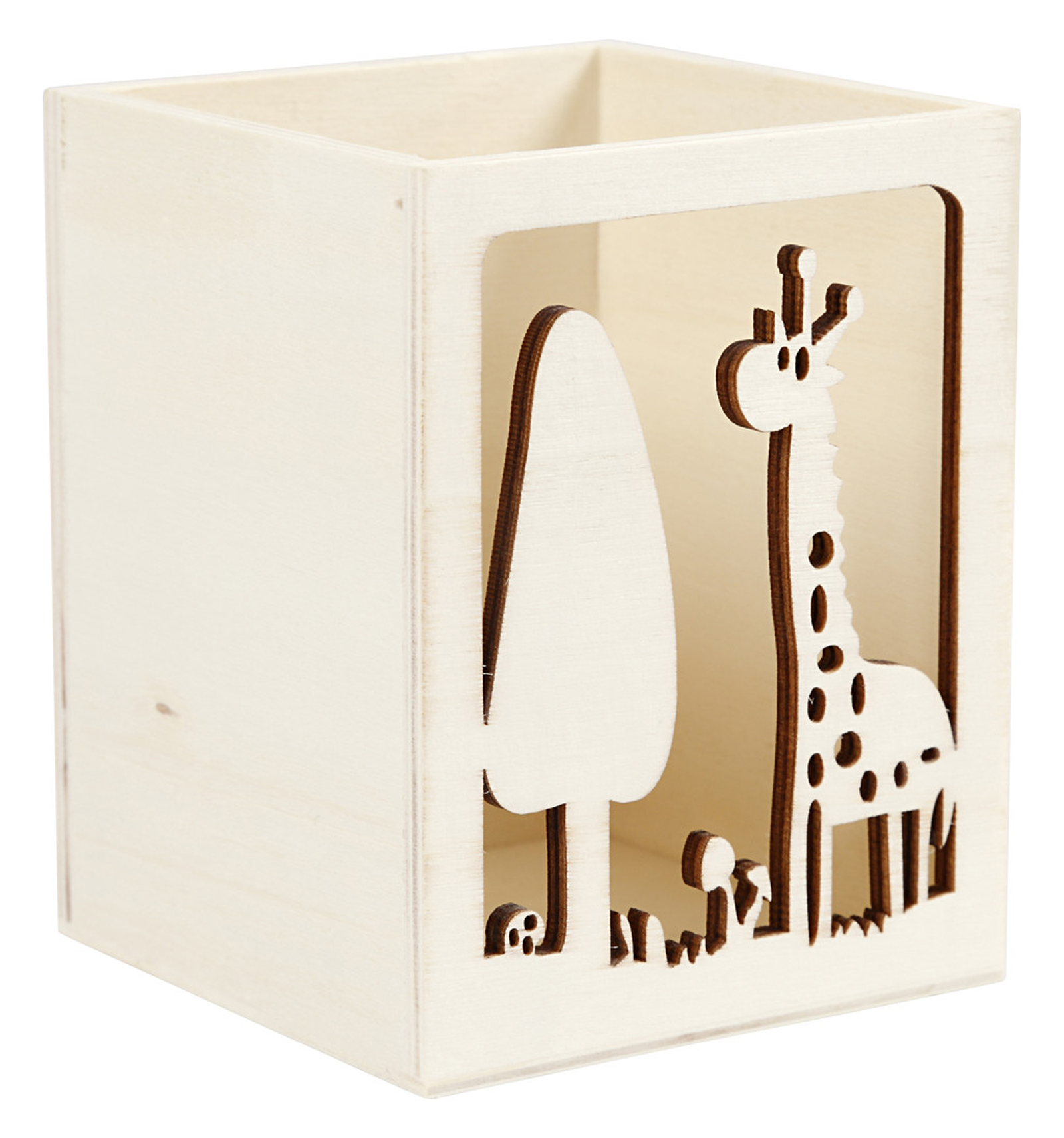 Vierkant pennenbakje van licht hout met uitgesneden motief aan één kant. Ideaal als pennenbakje of als lantaarn met LED lampje
