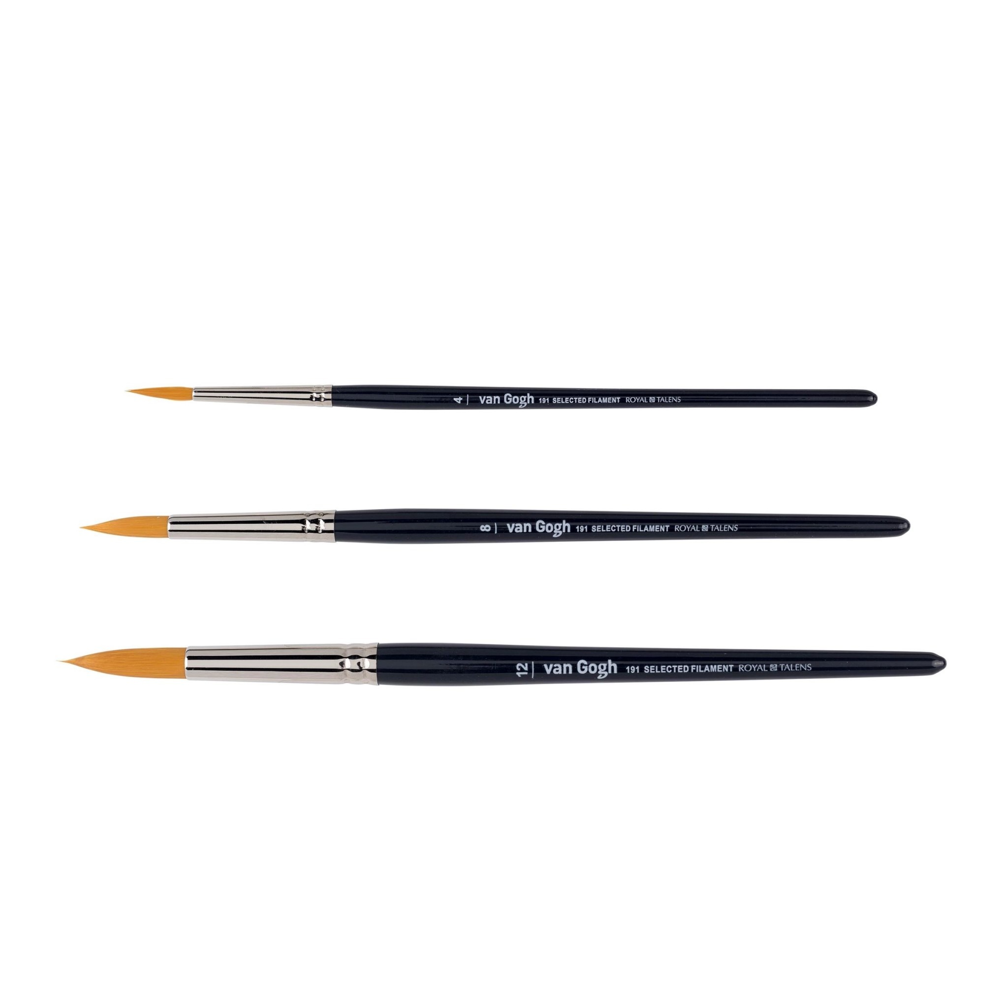 De aquarelpenselen in deze set zijn met zorg gemaakt en met de hand gevormd en hebben een flexibele haarbundel die bestand is tegen slijtage. De gouden synthetische haarbundel kan een grote hoeveelheid water opnemen en heeft een ronde vorm met een zeer fijne punt voor precisiewerk. De breedte van de haarbundels op de inbegrepen penselen is 3,3 mm, 5,7 mm en 8,1 mm