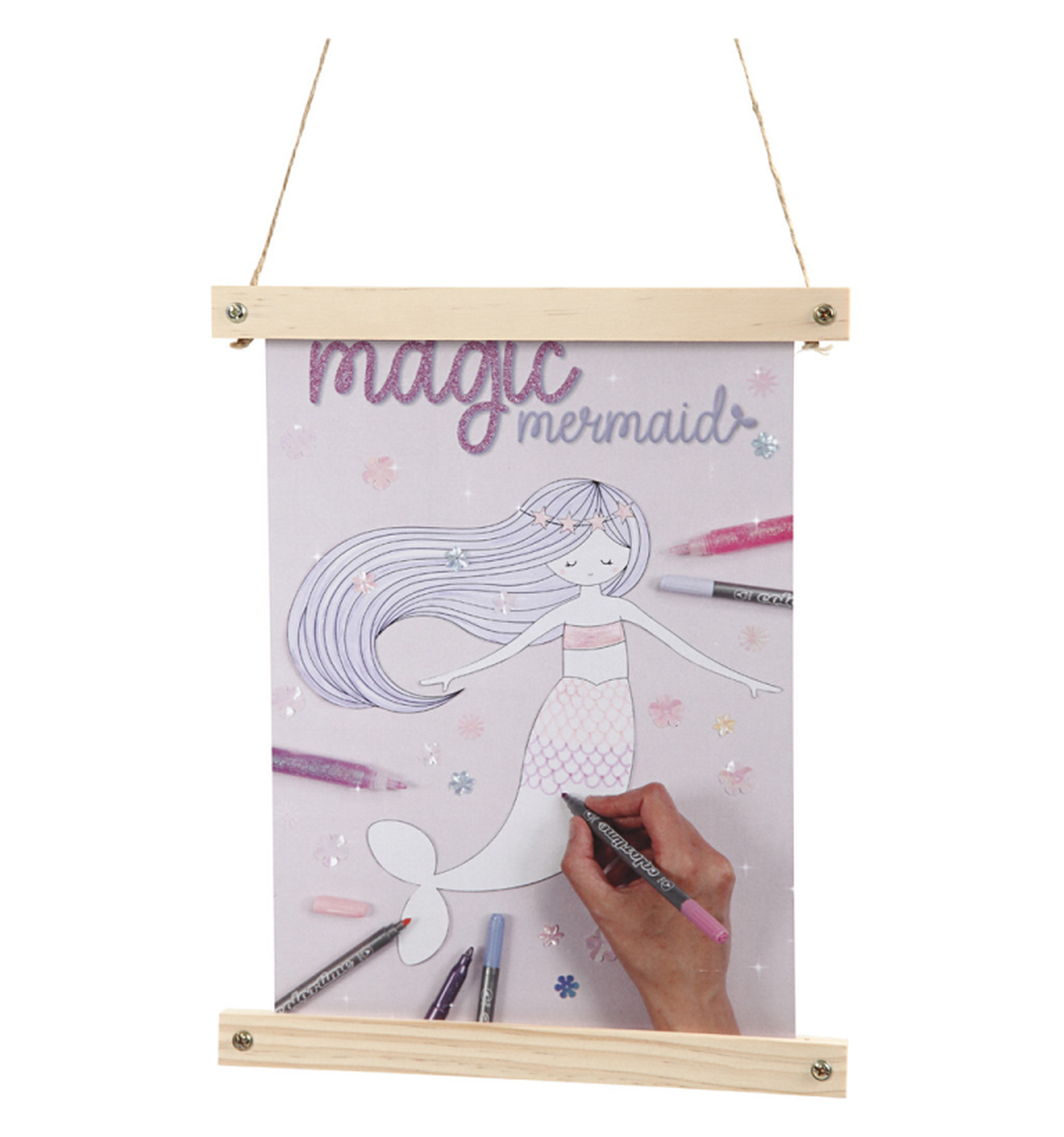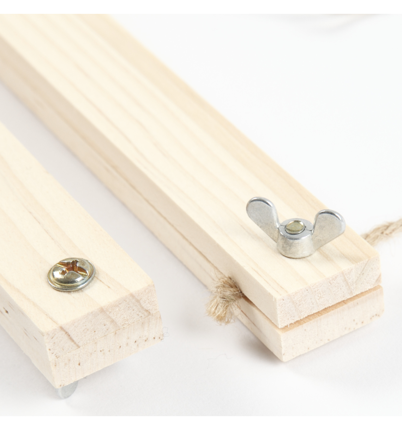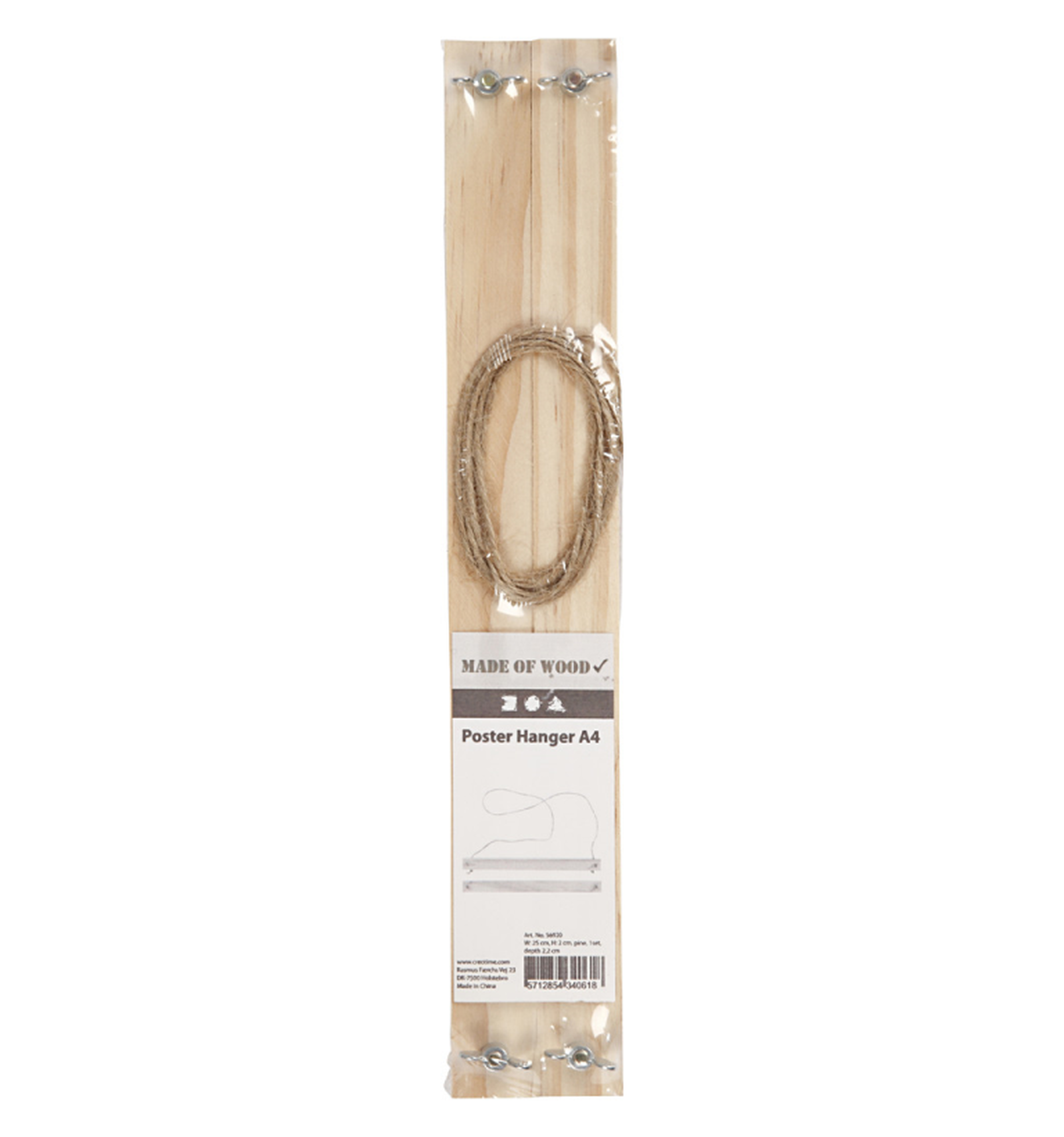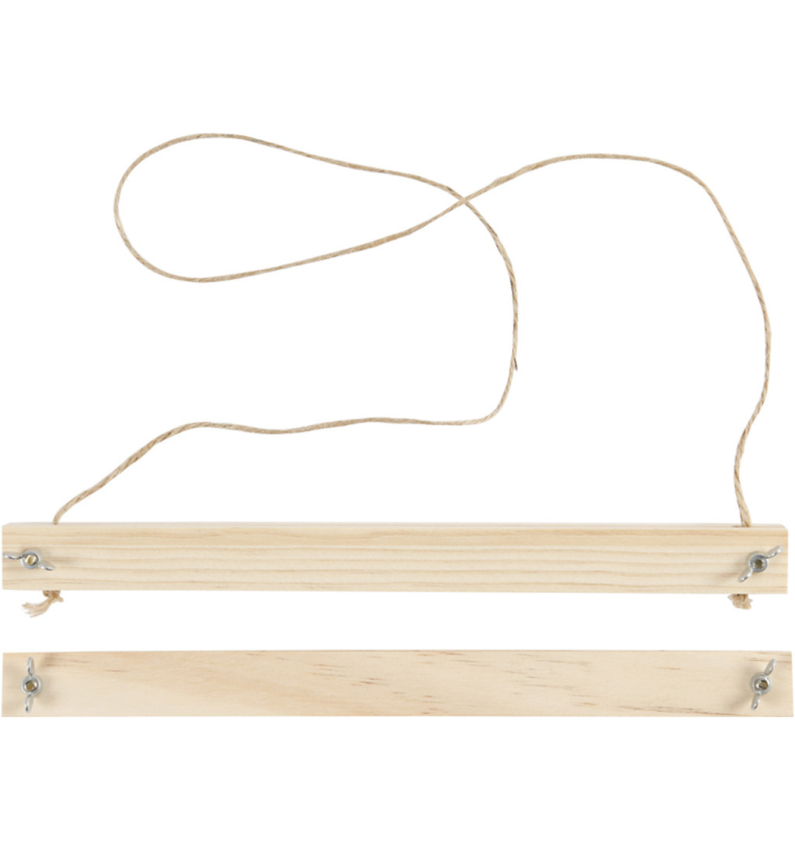 Set posterlijsten van licht hout bestaande uit 2 boven- en 2 onderlijsten, waarbij de ophanging wordt gefixeerd door middel van een vleugelmoer. Geleverd met apart ophangkoord, dat met een knoop aan de onderzijde van de bovenste strips is bevestigd