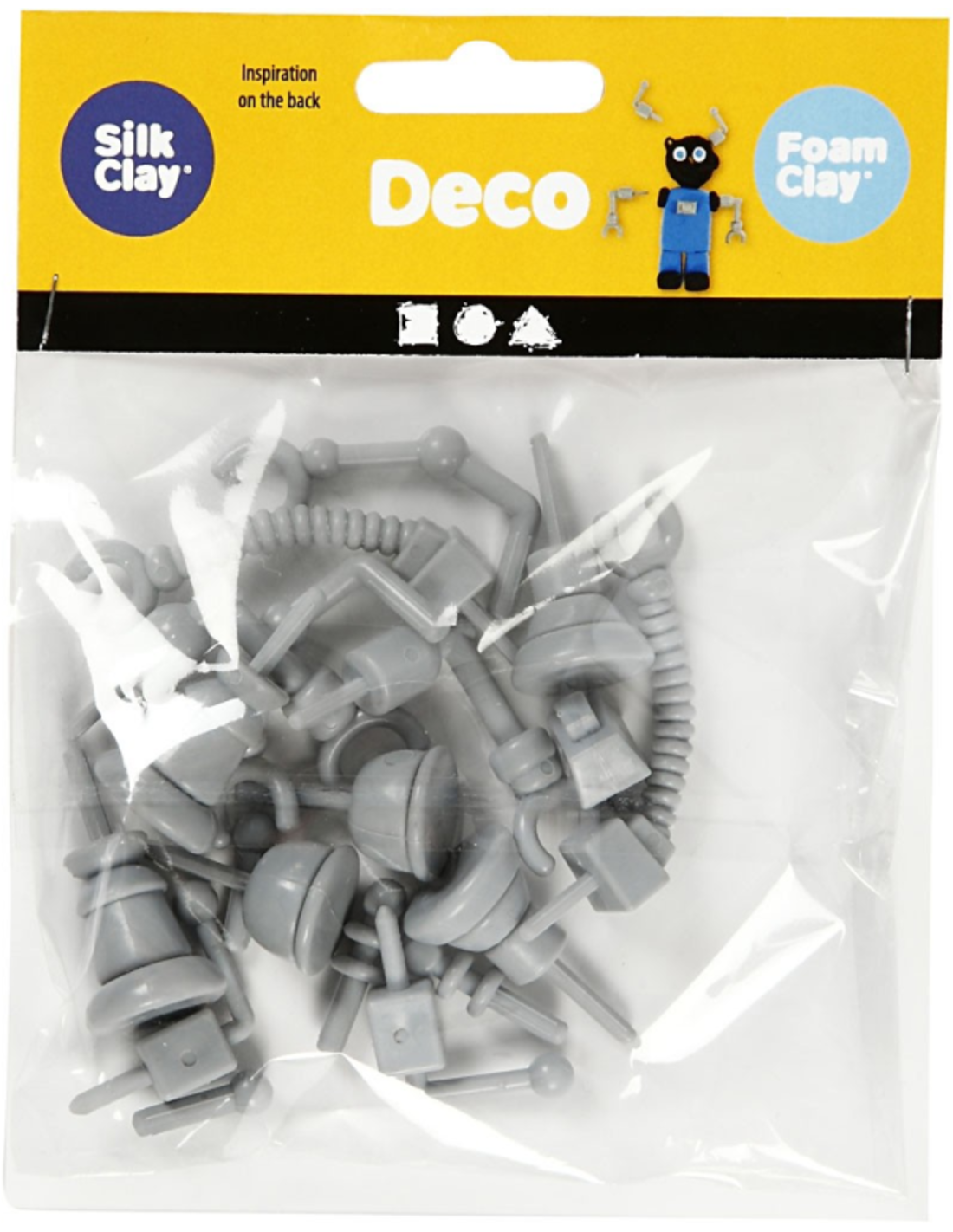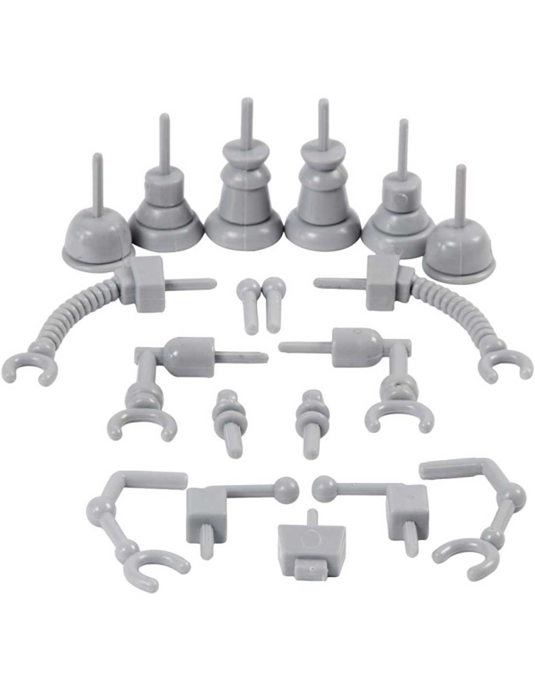 Assortiment kleine onderdelen om een robot te maken. Kan bevestigd worden in allerlei soorten klei