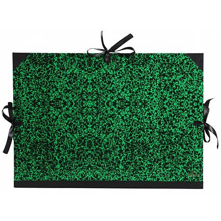 Een zwart en groen Annonay papier aan de buitenkant met vernis, aan de binnenkant wit zuurvrij papier.