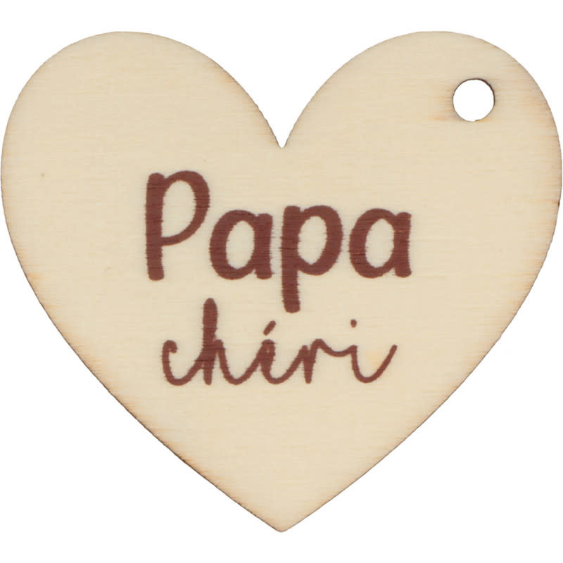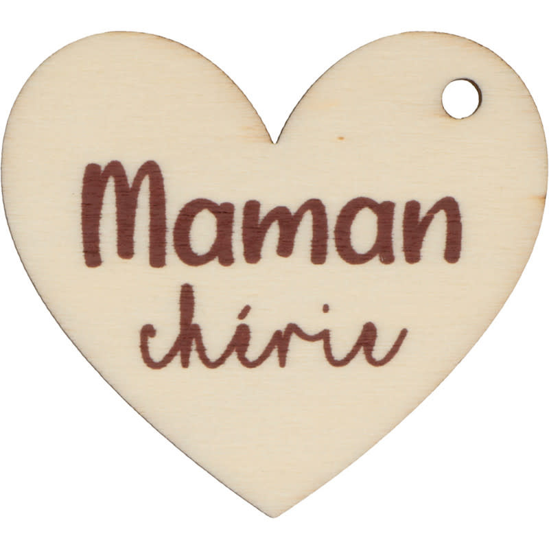 Formes en bois représentant des coeurs perforés avec les inscriptions "Maman chérie" et "Papa chéri"