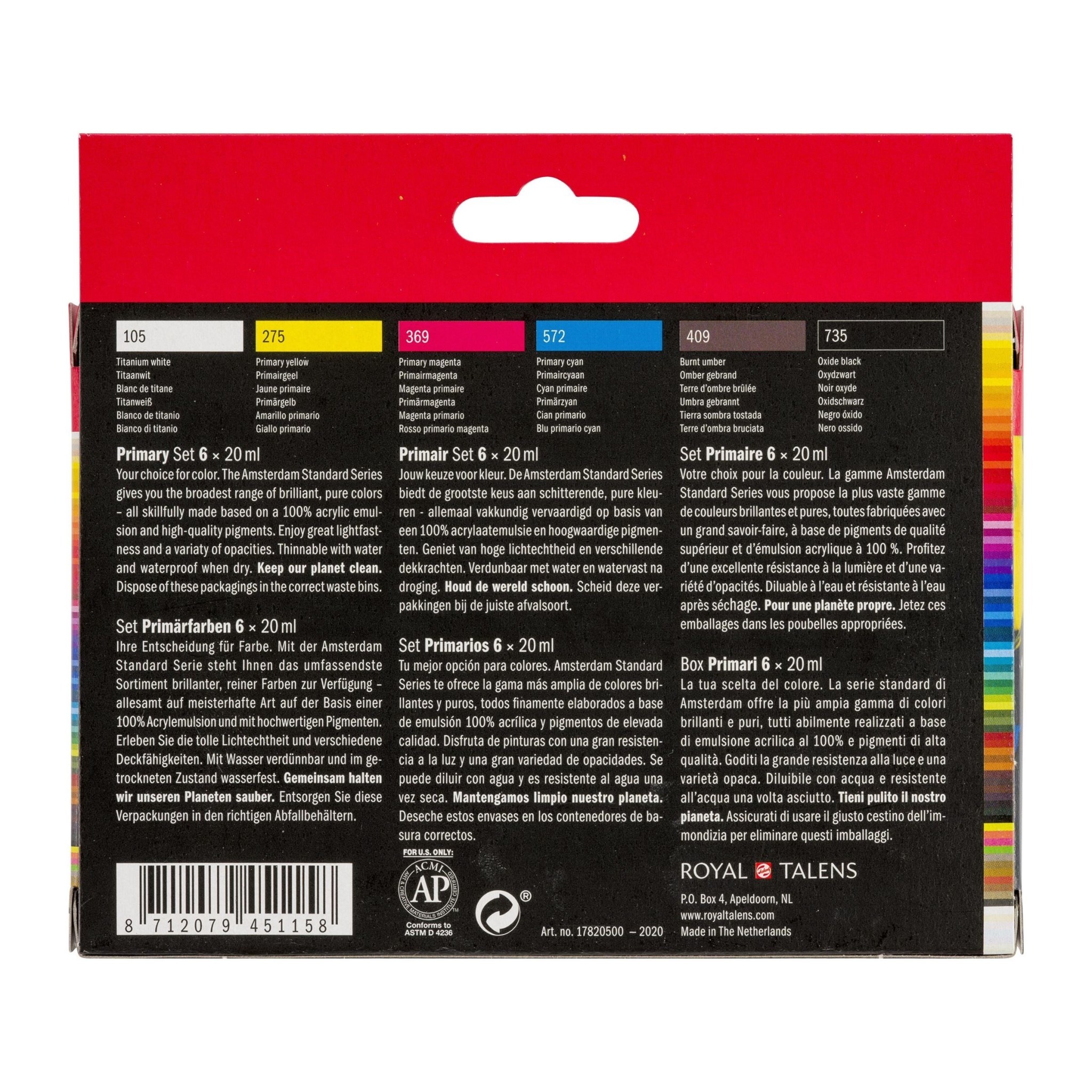 Deze set bevat 6 x 20 ml tubes acrylverf in primaire kleuren om je kleurenpalet mee te beginnen. Deze set bevat alle drie primaire kleuren met de toevoeging van Titaanwit, Omber Gebrand en Oxydzwart om een compleet basis kleurenpalet te creëren.