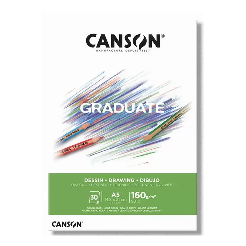 Canson Graduate Dessin pads bieden een resistent wit tekenpapier met een lichte nerf. Het oppervlak is bestand tegen herhaaldelijk schrobben zonder pluisjes. Deze blokken zijn opgebouwd uit 30 vellen, ze zijn perfect om te tekenen en een creatie te maken met levendige kleuren!