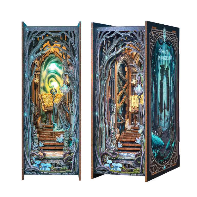 Een tovenaar in donkere gewaden staat voor een magisch oproepboek in het midden van de pilaar, met een toverstaf met een flitsend blauw licht, waarmee hij de mysterieuze geheime deur uit de legende oproept.