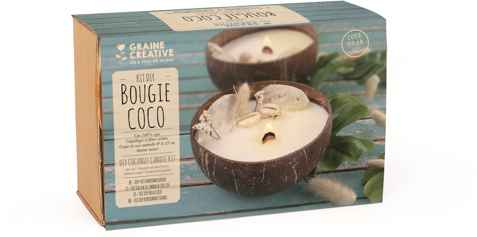 Reis met deze mooie kaars direct gegoten in een kokosnoot met een zoete geur van monoï om je zomeravonden te verfraaien. Inhoud van de set : sojawas, 1 kokosnoot, 1 dennenlont, 2 zeeschelpen, gedroogde bloemen, fles monoï geur, 1 handleiding in FR, EN, DL, ES, IT en NL.