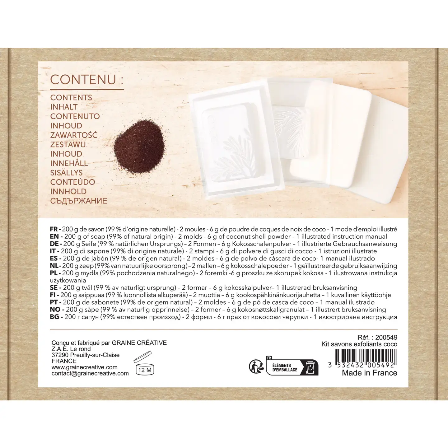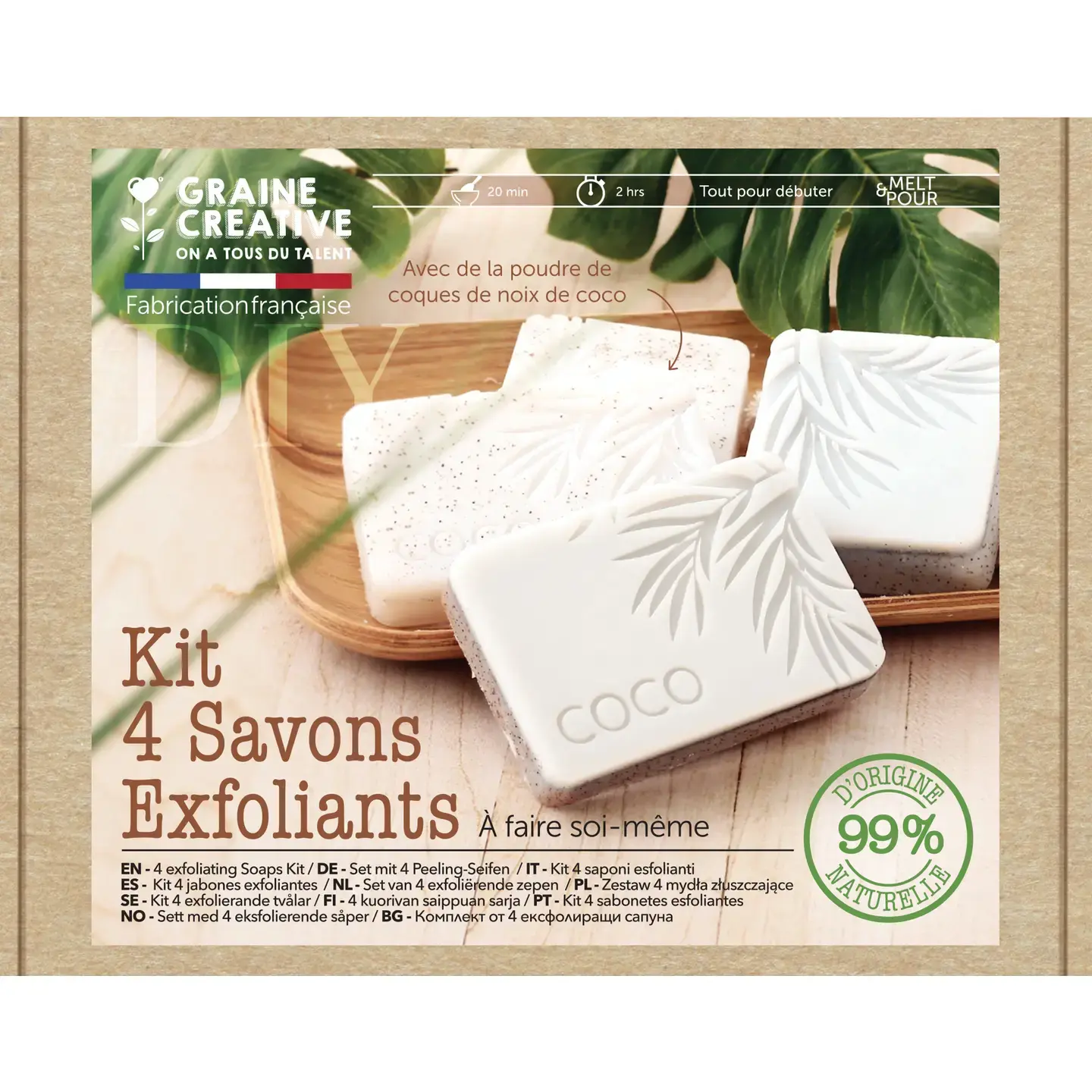 "Met deze complete set om je eigen zeep te maken, geef je je huid een tropisch zacht moment met deze complete set met onze nieuwe basis die voor 99% van natuurlijke oorsprong is. Exfolieert zachtjes dankzij de fijne en natuurlijke textuur van kokosnoot. Laat de huid zacht en gehydrateerd achter, maakt van het maken een speels en ontspannend moment."
