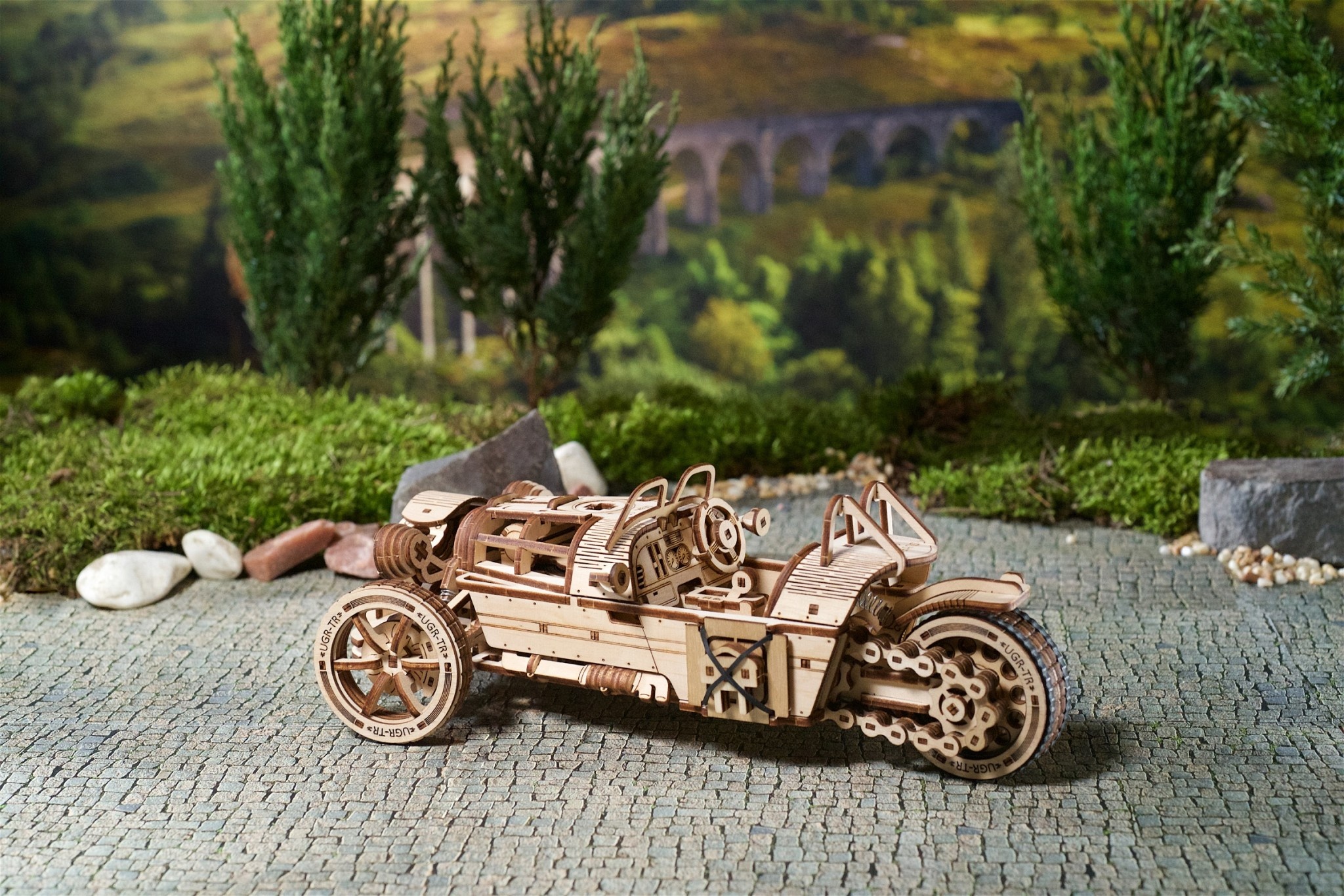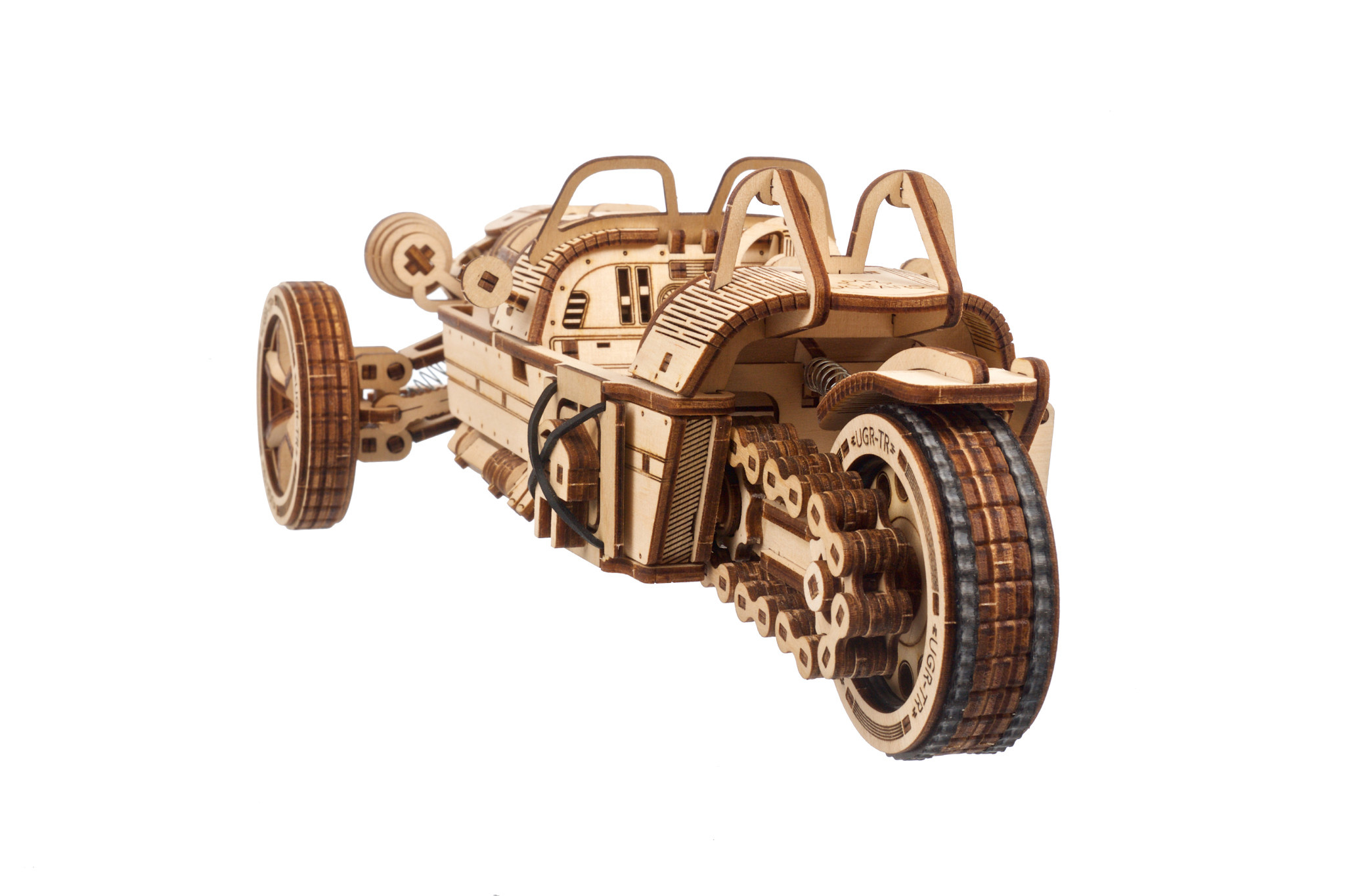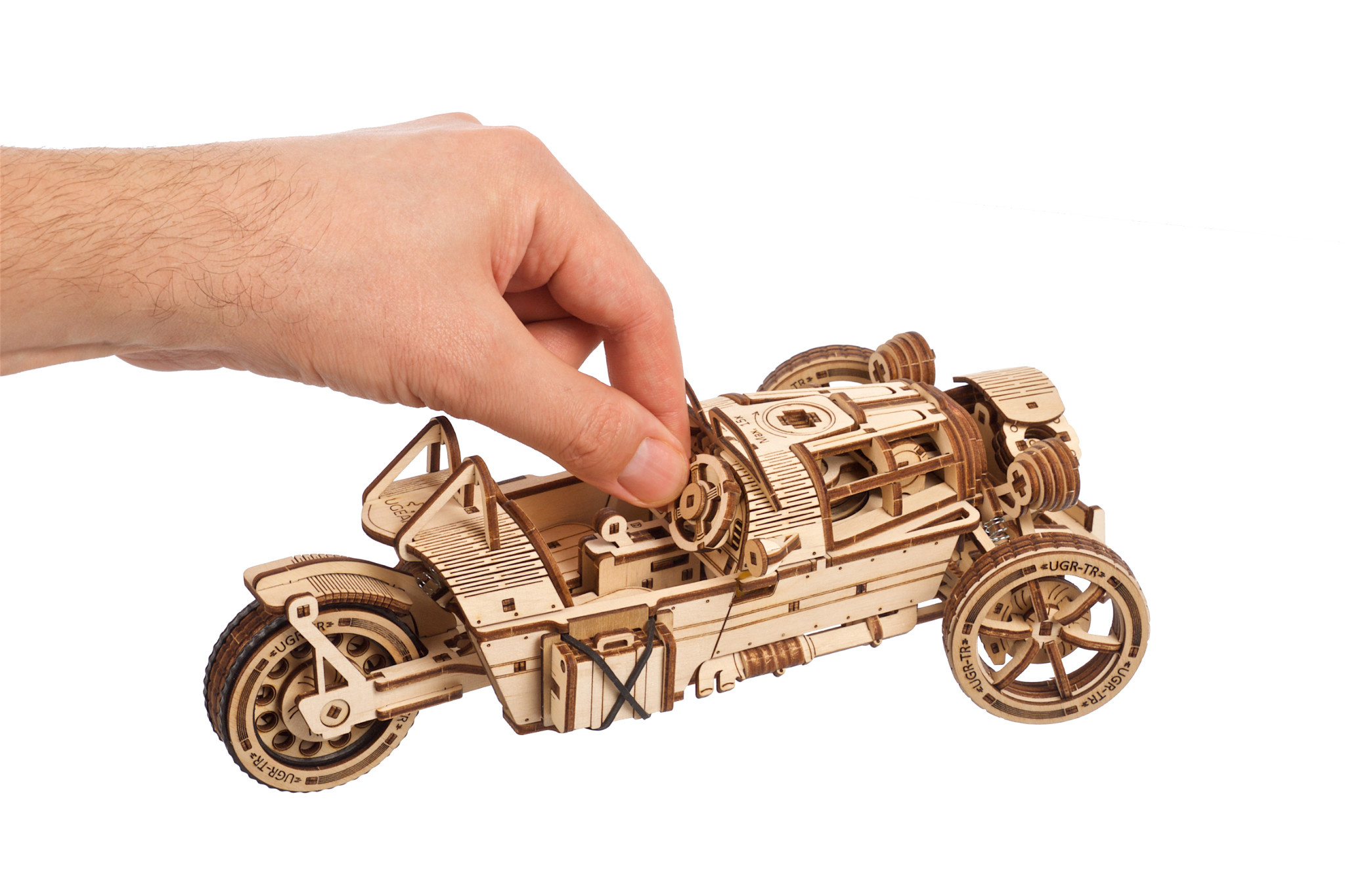 De driewieler UGR-S is de nieuwste en coolste toevoeging aan de Ugears-collectie motorfietsen en auto's. Deze stijlvolle tweezitter is een driewielige weg- en aandachtstrekker, met veeraandrijving, voor- en achter, een functioneel stuur en tal van geweldige details zoals bewegende zuigers, grote koplampen, aangepaste langs de zijkant lopende uitlaatpijpen, een koffer om in de aan de zijkant gemonteerde bagagedrager te plaatsen en lasergravure. En dat is nog niet alles: til de twee zijkanten van de motorkap op om de benzinetank en veermotor te zien! Is het een auto of een fiets, of iets daartussenin? Elke instantie heeft zijn eigen kijk op het verlenen van licenties voor trike-auto's - we weten gewoon dat ze erg leuk zijn! Trike-bestuurders zullen u vertellen dat hun machines het beste van twee werelden bieden: de sensatie van een motorfiets, met de stabiliteit en het rijgedrag van een auto. Trikes worden ook wel 'kikkervisjes' genoemd vanwege hun ontwerp met dikke voorkant. Ze hebben lage profielen en open cabines waardoor je je tijdens het autorijden verbonden voelt met de weg en de omgeving. Dan is er de aandacht die je krijgt van toeschouwers en de kameraadschap van groepsritten en rally's binnen de subcultuur van mede trike eigenaren. De Ugears Driewieler UGR-S kan ongeveer 4 meter in een rechte lijn gaan, of de wielen draaien met behulp van het stuur voor sierlijke bochten. De aandrijflijn van de driewieler UGR-S omvat de veermotor en een unieke keongaandrijving naar het achterwiel - een primeur in de Ugears catalogus. Voor die extra "wow"-factor waar Ugears bekend om staat, zijn er twee bewegende zuigers op de decoratieve motor voorin. Dit doe-het-zelf driewieler model heeft een afneembare opwind sleutel die in een van de bagagevakken aan de zijkant van het model wordt opgeborgen. Zet de versnellingspook in de "Park"-modus, steek de sleutel in de motorkap, geef maximaal 15 omwentelingen en start de driewieler door de versnellingspook in de "Drive"- modus te zetten. Bekijk die prachtige zuigers en keongaandrijving in actie terwijl de trike wegrijdt in de gewenste richting. De driewieler UGR-S is zo ontworpen dat u hem met de hand kunt voortduwen, zonder de veermotor in te schakelen.