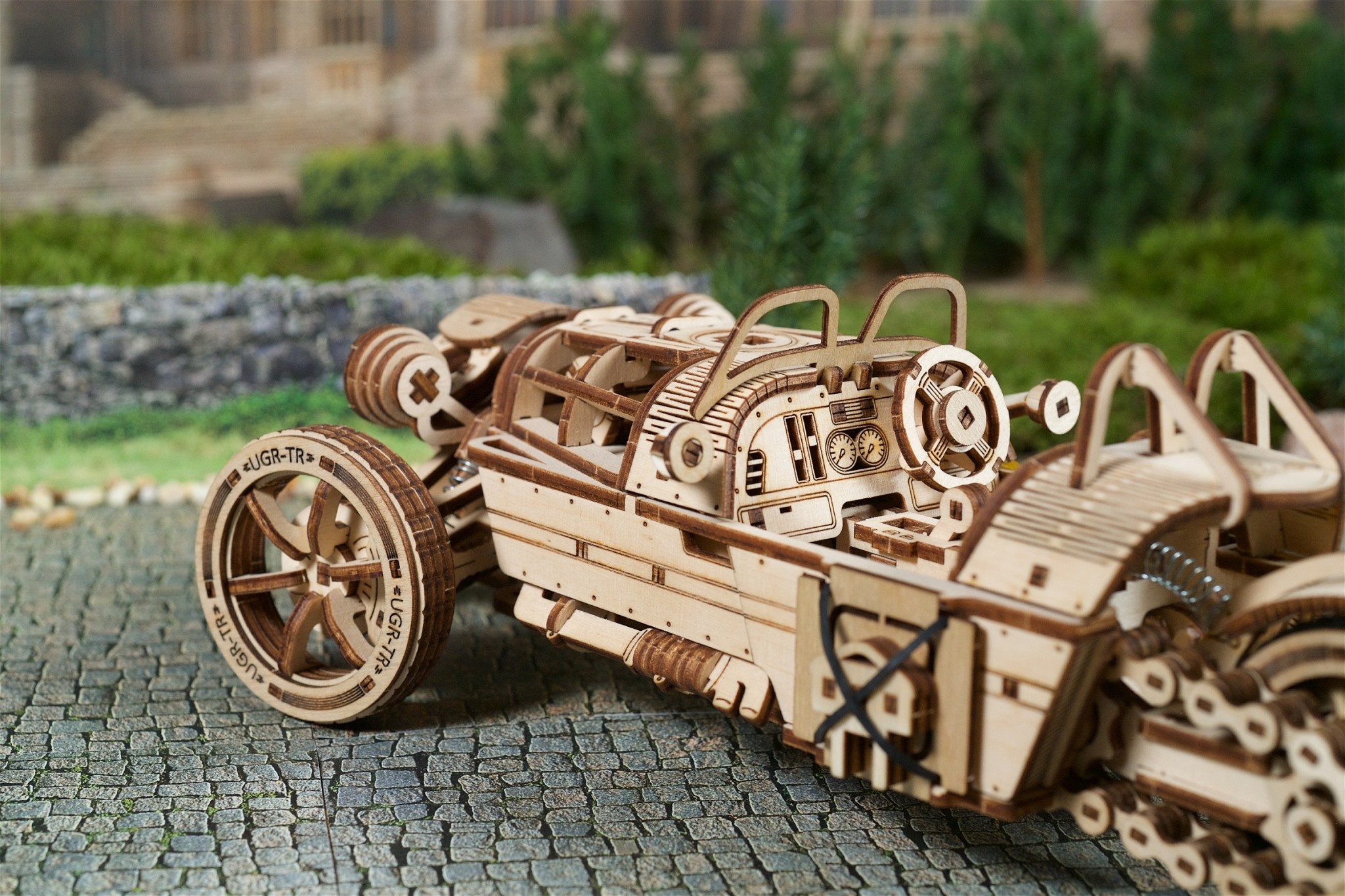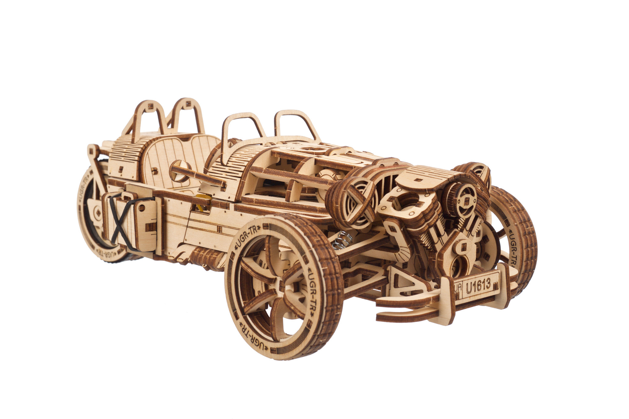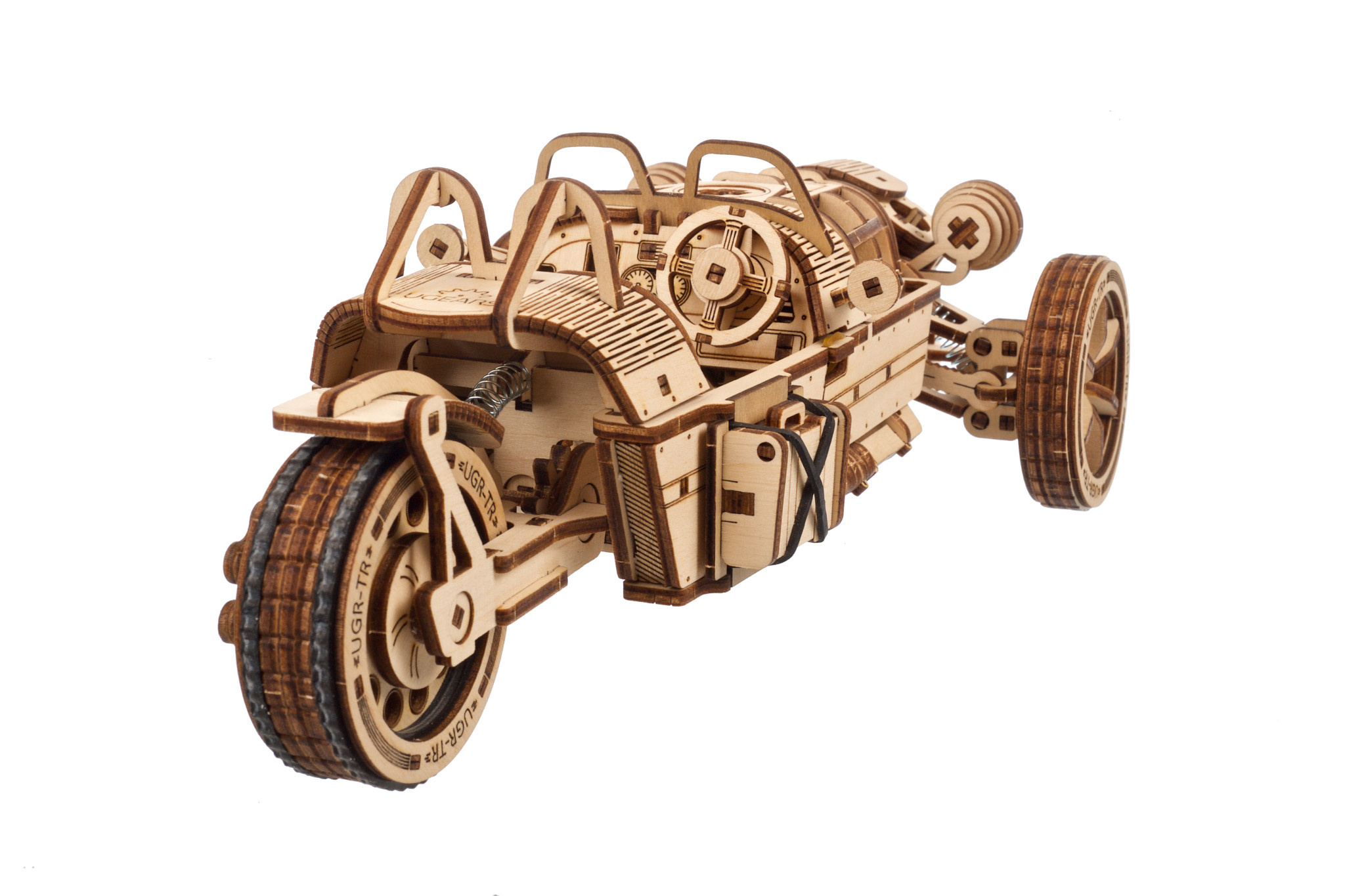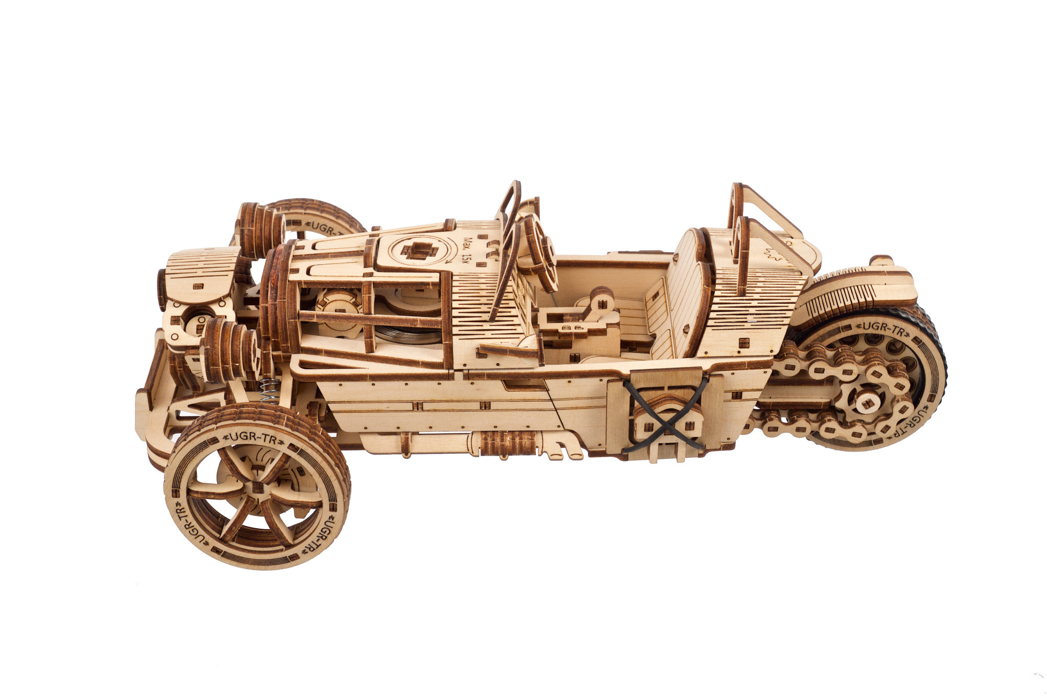 De driewieler UGR-S is de nieuwste en coolste toevoeging aan de Ugears-collectie motorfietsen en auto's. Deze stijlvolle tweezitter is een driewielige weg- en aandachtstrekker, met veeraandrijving, voor- en achter, een functioneel stuur en tal van geweldige details zoals bewegende zuigers, grote koplampen, aangepaste langs de zijkant lopende uitlaatpijpen, een koffer om in de aan de zijkant gemonteerde bagagedrager te plaatsen en lasergravure. En dat is nog niet alles: til de twee zijkanten van de motorkap op om de benzinetank en veermotor te zien! Is het een auto of een fiets, of iets daartussenin? Elke instantie heeft zijn eigen kijk op het verlenen van licenties voor trike-auto's - we weten gewoon dat ze erg leuk zijn! Trike-bestuurders zullen u vertellen dat hun machines het beste van twee werelden bieden: de sensatie van een motorfiets, met de stabiliteit en het rijgedrag van een auto. Trikes worden ook wel 'kikkervisjes' genoemd vanwege hun ontwerp met dikke voorkant. Ze hebben lage profielen en open cabines waardoor je je tijdens het autorijden verbonden voelt met de weg en de omgeving. Dan is er de aandacht die je krijgt van toeschouwers en de kameraadschap van groepsritten en rally's binnen de subcultuur van mede trike eigenaren. De Ugears Driewieler UGR-S kan ongeveer 4 meter in een rechte lijn gaan, of de wielen draaien met behulp van het stuur voor sierlijke bochten. De aandrijflijn van de driewieler UGR-S omvat de veermotor en een unieke keongaandrijving naar het achterwiel - een primeur in de Ugears catalogus. Voor die extra "wow"-factor waar Ugears bekend om staat, zijn er twee bewegende zuigers op de decoratieve motor voorin. Dit doe-het-zelf driewieler model heeft een afneembare opwind sleutel die in een van de bagagevakken aan de zijkant van het model wordt opgeborgen. Zet de versnellingspook in de "Park"-modus, steek de sleutel in de motorkap, geef maximaal 15 omwentelingen en start de driewieler door de versnellingspook in de "Drive"- modus te zetten. Bekijk die prachtige zuigers en keongaandrijving in actie terwijl de trike wegrijdt in de gewenste richting. De driewieler UGR-S is zo ontworpen dat u hem met de hand kunt voortduwen, zonder de veermotor in te schakelen.