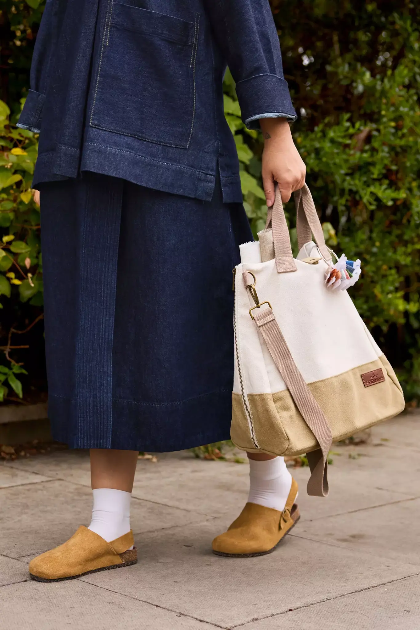 Dankzij deze draagtas vervoer je jouw creatieve spullen probleemloos. Deze stijlvolle tas in ecru en kaki heeft taupe handvatten, een verstelbare schouderband en een magnetische druksluiting. Dankzij de ritssluiting kun je hem volledig plat openen, waardoor hij gemakkelijker te gebruiken is. Organiseer al je benodigdheden moeiteloos in het grote gaasvak en de drie vakken met ritssluiting. Het moderne ontwerp wordt gecompleteerd door een label van imitatieleer met het DMC Eco Vita-logo. Afmetingen 30 x 36 cm