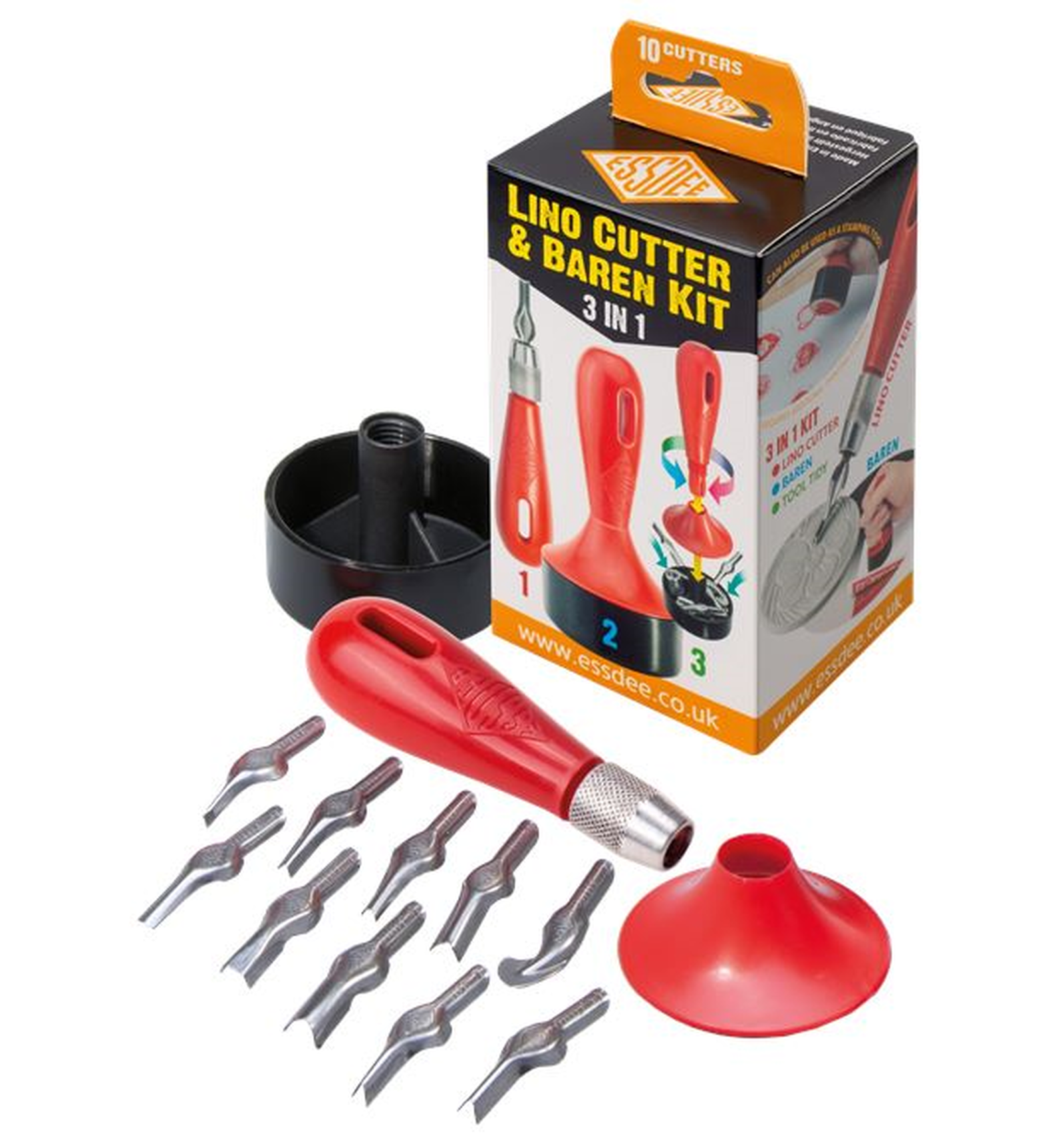De Essdee 3 in 1 Lino Cutter and Baren Kit is een handige set met 5 of 10 lino cutters van hoogwaardig staal en een stevig handvat. Je kunt de cutters gemakkelijk bevestigen en aanspannen. De kit is ook om te bouwen tot een Baren, waarmee je de inkt van je drukblok op papier kunt overbrengen zonder een drukpers. De Baren basis dient ook als opbergdoos voor de cutters. Superhandig!