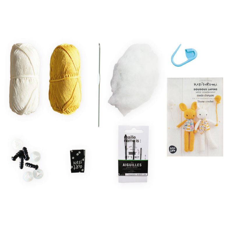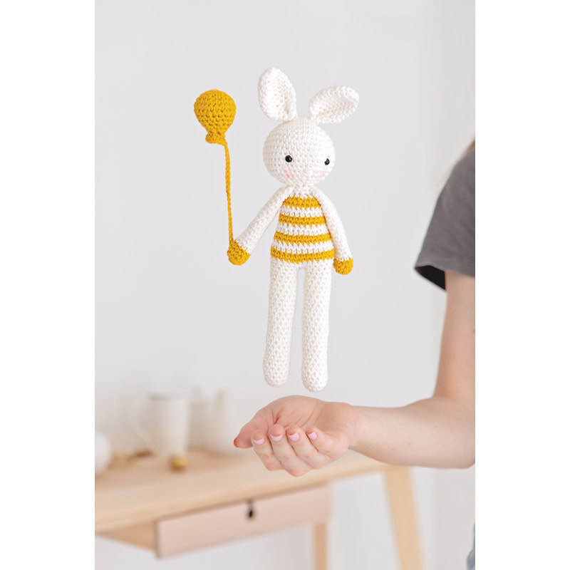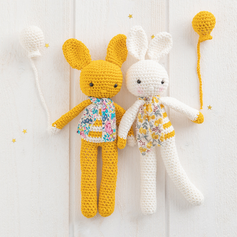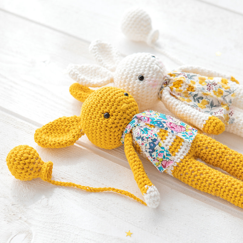Kent u de gehaakte amigurumi? Het is de kunst van het haken van kleurrijke beestjes en ander kinderspeelgoed met katoenen garen. We hebben de perfecte set bedacht om je kennis te laten maken met deze praktijk door een duo knuffels voor konijnen met grote oren te haken. Vergezeld door hun kleine ballonnen hebben ze alles om de harten van de kleintjes te plezieren en te veroveren!