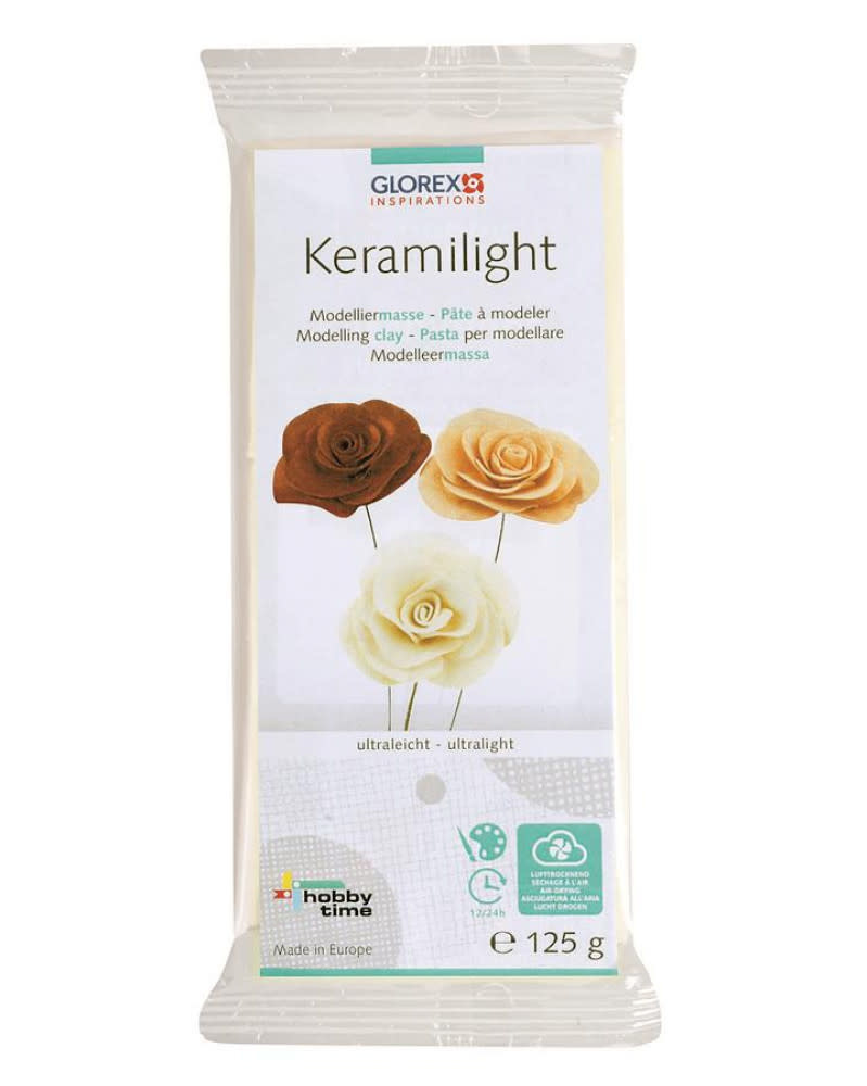 Keramilight est une masse à modeler ultra légère et durcit à l'air. Une fois durci Keramilight est extrêmement léger et dur, les modèles finis peuvent être limés, percés et peints. Keramilight est particulièrement adapté pour la fabrication de pièces filiformes tels que des fleurs ou des mobiles et aussi la technique des serviettes en 3D.