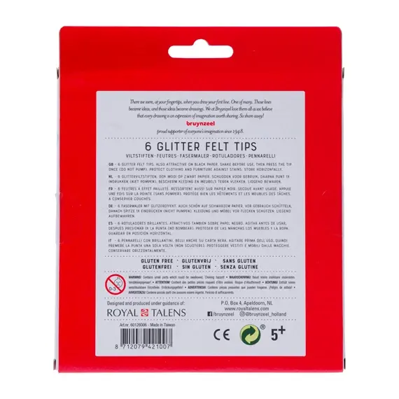 Met deze viltstiften maak je prachtige glittereffecten! Schud de stift voor gebruik en druk één keer op de punt, dan ben je klaar om je creativiteit de vrije loop te laten! De verpakking bevat 6 stiften in briljante kleuren. Geschikt voor kinderen vanaf 5 jaar. Kenmerken: Goede kleurweergave - Prachtig op wit en zwart papier.