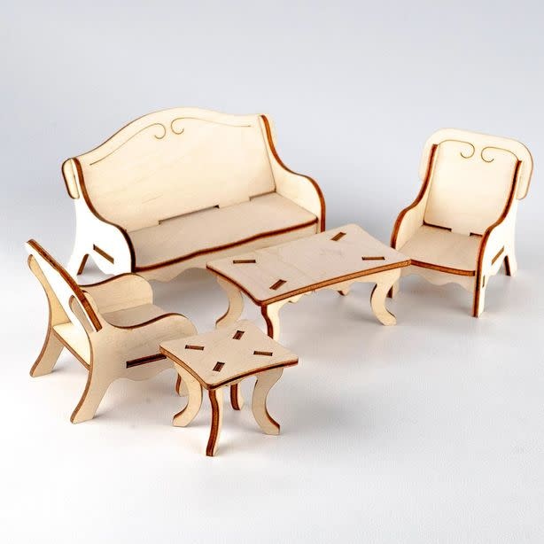 Deze realistische houten set bestaat uit een bank, twee fauteuils, een salontafel en een tafel. Alle stukken zijn gemaakt van duurzaam berken multiplex. Het stevige ontwerp van elk stuk zorgt ervoor dat de set generaties lang wordt doorgegeven. Het is gemonteerd, zoals al ons speelgoed, zonder lijm.