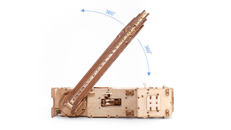 Mechanische 3D puzzel van een brandweerwagen om zelf in elkaar te zetten. Model met elastisch opwindmechanisme met sleutel, intrekbare en draaibare brandtrap, draaiende voorwielen en openende voordeuren, intrekbare vrachtwagenstops.