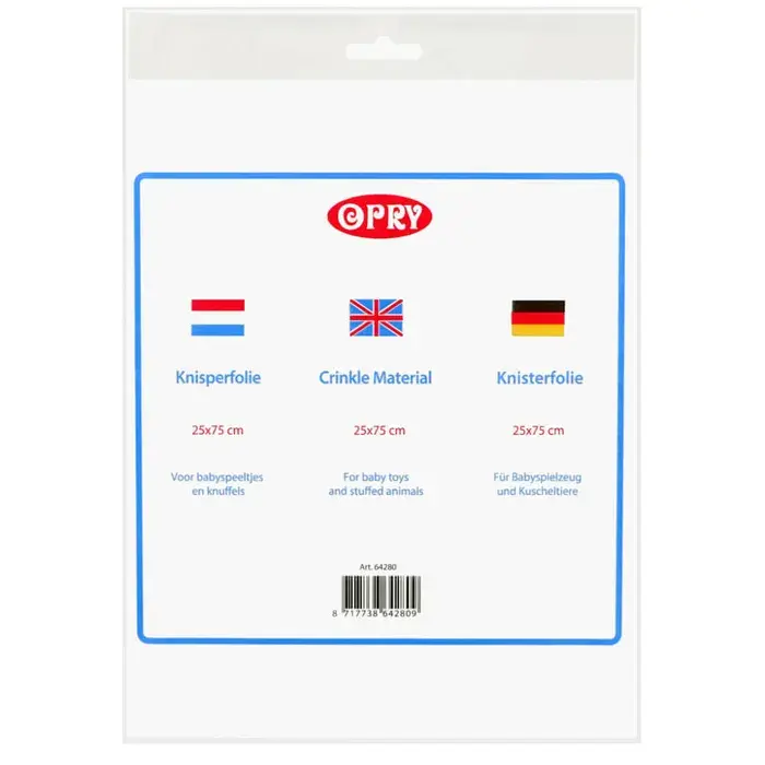 Plaats de knisperfolie in speelgoed voor baby’s en in kinderboeken en doekjes om een stimulerend geluid toe te voegen. Het is wasbaar tot 90°C. Het knisperfolie meet 25 x 75cm