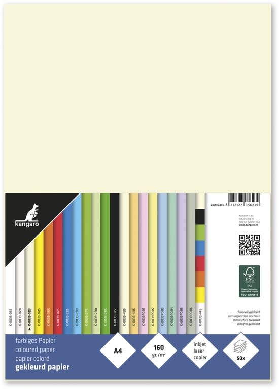 160 Grams FSC gekleurd, houtvrij en chloorvrij gebleekt papier.