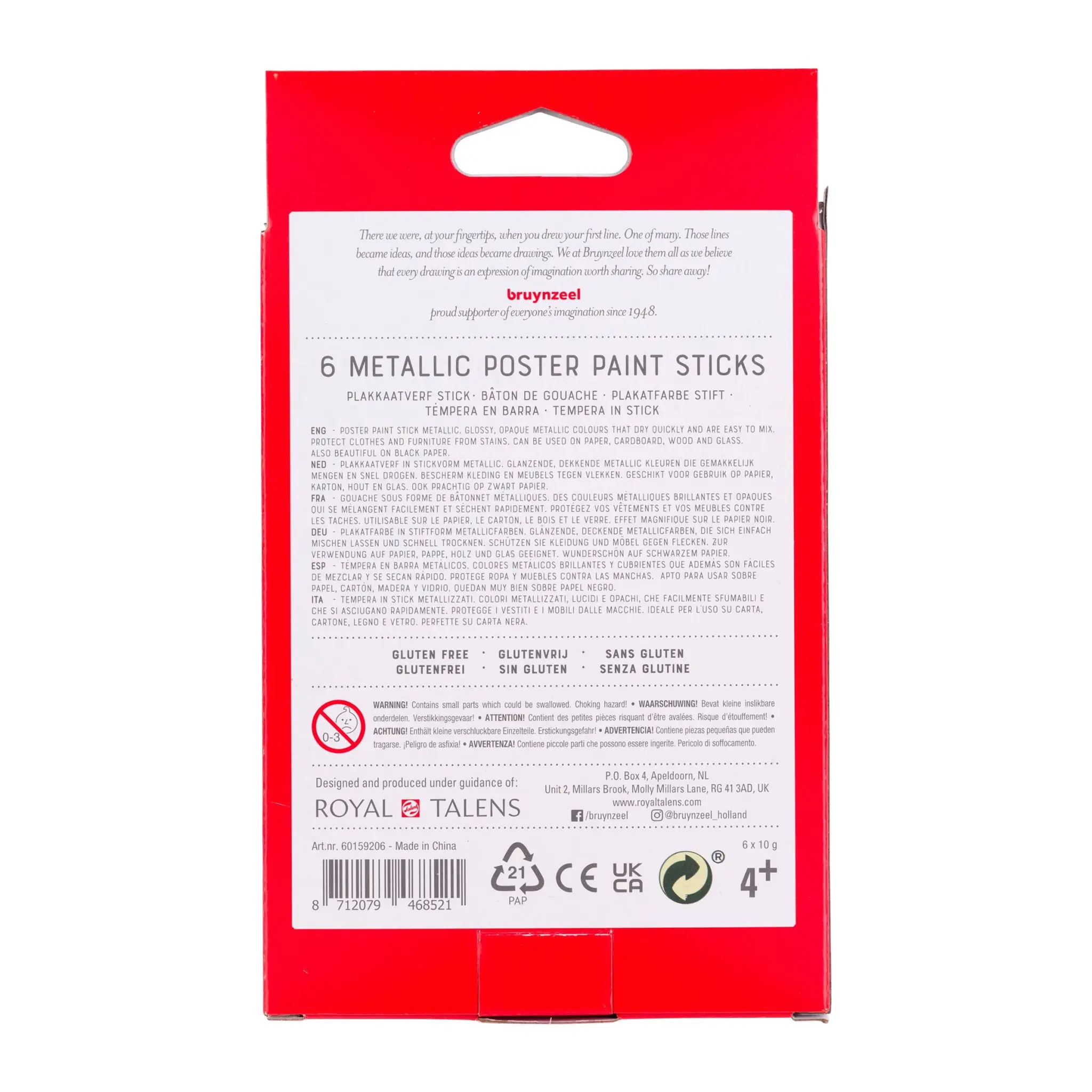 Deze stiften met plakkaatverf zijn speciaal ontwikkeld voor jonge kunstenaars en stimuleren de fijne motoriek. Verfresten zijn makkelijk van de handen te wassen met water en zeep. Bescherm kleding en meubels tegen vlekken. Mochten er vlekken ontstaan op stoffen, was ze dan direct met water en zeep. Geschikt voor gebruik op papier, karton, hout en glas. Inhoud: 6 x 10 gram.