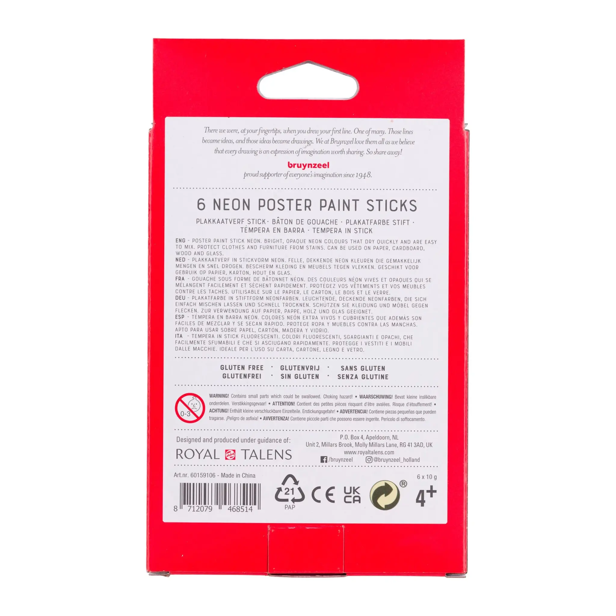 Deze stiften met plakkaatverf zijn speciaal ontwikkeld voor jonge kunstenaars en stimuleren de fijne motoriek. Verfresten zijn makkelijk van de handen te wassen met water en zeep. Bescherm kleding en meubels tegen vlekken. Mochten er vlekken ontstaan op stoffen, was ze dan direct met water en zeep. Geschikt voor gebruik op papier, karton, hout en glas. Inhoud: 6 x 10 gram.