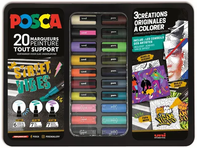 Met deze Posca set leer je om een echte Posca artiest te worden. In deze metalen koffer zitten maar liefst 20 Uni Posca verfmarkers in street vibes kleuren om met je Posca collectie te beginnen. Deze set bevat 6x PC-1MC (dikte 0,7 1 mm), 7x PC-3M (dikte 1,5 mm) en 7x PC-5M (dikte 2,5 mm) in de volgende kleuren:6 x PC-1MC zwart, lichtroze, koraalrood, donkerblauw, aquagroen en lichtblauw7 x PC-3M smaragsgroen, leisteengrijs, marineblauw, kakigroen, geel, rood en donker oranje 7 x PC-5M oker, lavendel, fluo roze, beige, appelgroen, engels groen en cacaobruinDe Posca marker is bijzonder geschikt om te schrijven, tekenen, schilderen en decoreren op verschillende ondergronden zoals karton, metaal, hout, plastic, keramiek, textiel, steen en glas. Met de speciale inkt op waterbasis teken je dekkend, ondoorzichtig en met mat effect.