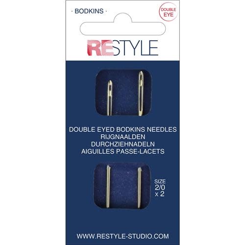 Deze rijgnaalden hebben twee ogen en een stompe punt. Een langwerpig oog dat geschikt is voor platte elastieken, linten of bandjes en een ronder kleiner oog voor ronde elastieken en koordjes.