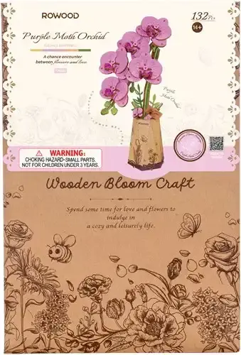 De TW091 Rowood roze vlinderorchidee is een decoratief houten bouwpakket voor volwassenen en kinderen ouder dan 14 jaar. Het ontwerp bestaat uit vijf bloemkoppen met groene stelen, geplaatst in een kartonnen vaasje dat is versierd met illustraties van insecten. Een klein kaartje met de tekst "For You" maakt het geheel geschikt als blijvend geschenk of sfeervolle toevoeging aan een interieur.