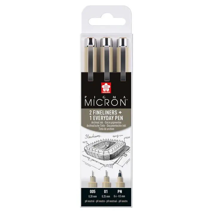 De set bevat 1 Pigma Micron 005 0,2 mm, 1 Pigma Micron 01 0,25 mm en 1 Pigma Micron PN.