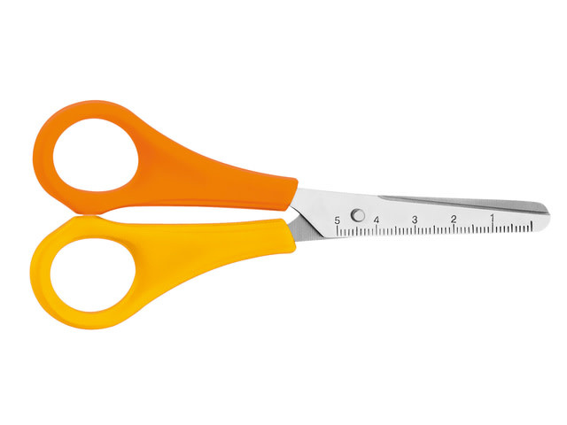 Kinderschaar, 13cm. Met ronde punt. Geschikt vanaf 4 jaar. Voorzien van 5 cm schaalindeling. Garantie: 3 jaar. Geleverd in polyzak met Euroloch. Kleur geel/oranje, linkshandig.