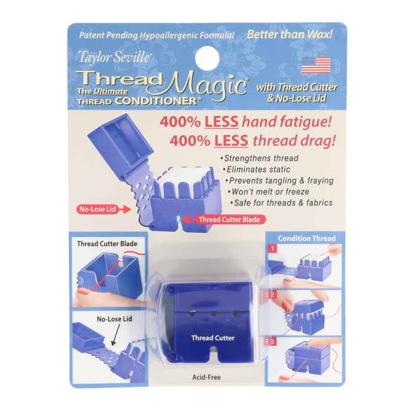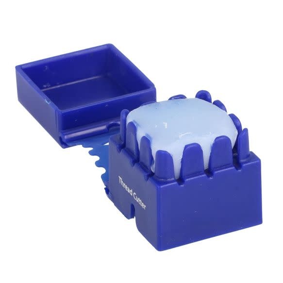 Deze Thread Magic Conditioner zit in een blauwe afsluitbare container, waar u uw naaigaren doorheen leidt. Deze vorm is ideaal voor het naaien met de hand en heeft een ingebouwde garensnijder.