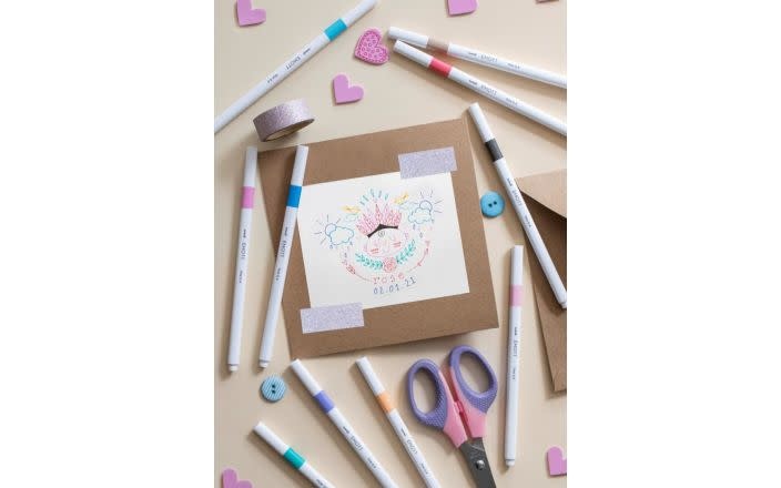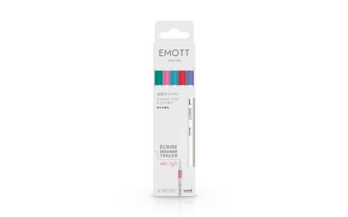 5 Uni Emott fineliners in snoepkleuren. De Uni Emott is een schrijf- en tekenstift die verkrijgbaar is in 40 kleuren. Deze fineliner heeft een fijne punt van 0.4 mm. Geschikt om mee te schrijven, tekenen en lijnen trekken. De zeer sterke punt trekt niet krom, splijt niet en geeft altijd strakke, regelmatige lijnen. De inkt is op pigment- en waterbasis en drukt niet door het papier. Vervaagt niet. Ook loopt de inkt niet uit en vlekt niet.