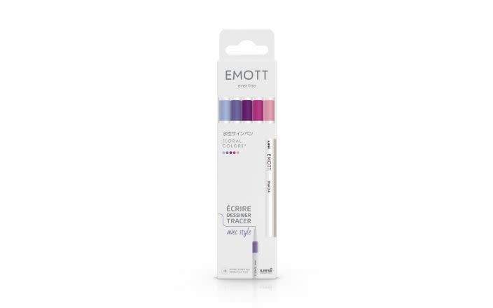 5 Uni Emott fineliners in bloemen kleuren. De Uni Emott is een schrijf- en tekenstift die verkrijgbaar is in 40 kleuren. Deze fineliner heeft een fijne punt van 0.4 mm. Geschikt om mee te schrijven, tekenen en lijnen trekken. De zeer sterke punt trekt niet krom, splijt niet en geeft altijd strakke, regelmatige lijnen. De inkt is op pigment- en waterbasis en drukt niet door het papier. Vervaagt niet. Ook loopt de inkt niet uit en vlekt niet.