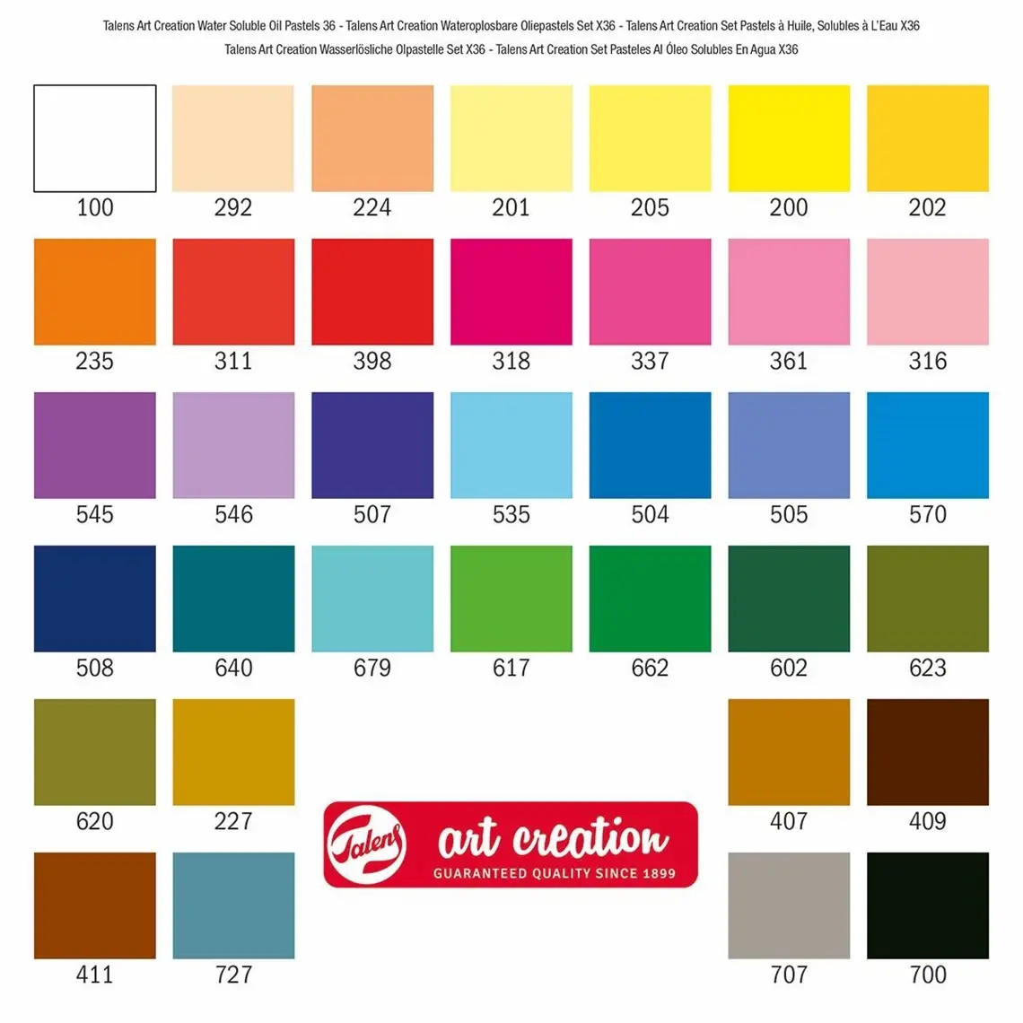 Inhoud: 36 pastels (100 Wit – 292 Napelsgeel Rood Licht – 224 Napelsgeel Rood – 201 Lichtgeel – 205 Citroengeel (Primair) – 200 Geel – 202 Donkergeel – 235 Oranje – 311 Vermiljoen – 398 Naftolrood Licht – 318 Karmijn – 337 Magenta – 361 Lichtrose – 316 Venetiaansrose – 545 Roodviolet – 546 Roodviolet Licht – 507 Ultramarijnviolet – 535 Ceruleumblauw (Phtalo) – 504 Ultramarijn – 505 Ultramarijn Licht – 570 Phtaloblauw – 508 Pruissischblauw – 640 Blauwgroen – 679 Blauwgroen Licht – 617 Geelgroen – 662 Permanentgroen – 602 Donkergroen – 623 Sapgroen – 620 Olijfgroen – 227 Gele Oker – 407 Donkere Oker – 409 Omber Gebrand – 411 Sienna Gebrand – 727 Blauwgrijs – 707 Muisgrijs – 700 Zwart).