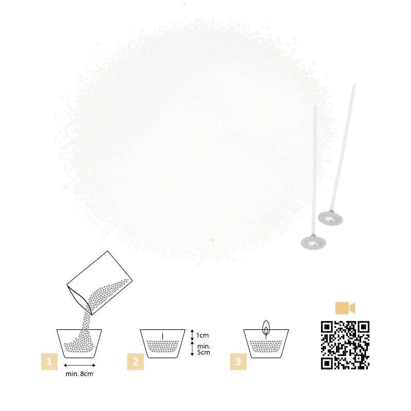 Wit kaarsenzand wordt geleverd in een zak van 250 g.